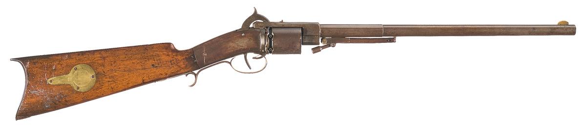 Made circa 1849, with total quantity estimated between 50 and 100. The main distinguishing feature is the long hook type cylinder release latch located ahead of the trigger, passing through the front of the trigger guard. The manually rotating 6-shot grooved cylinder is non-retracting and bears a faint etched motif. Equipped with a loading lever and a safety shield. The frame is marked "WARNER'S / PATENT" on the left side and "JAMES WARNER / SPRINGFIELD MASS." faintly on the right. "62" is marked on the loading lever and "0" is marked near one of the two tapped holes on the barrel underside near the breech. Half moon front sight and fixed notch rear sight. Mounted on a smooth straight grip stock with a brass patch box on the right side and a series of numbers scratched into the left.