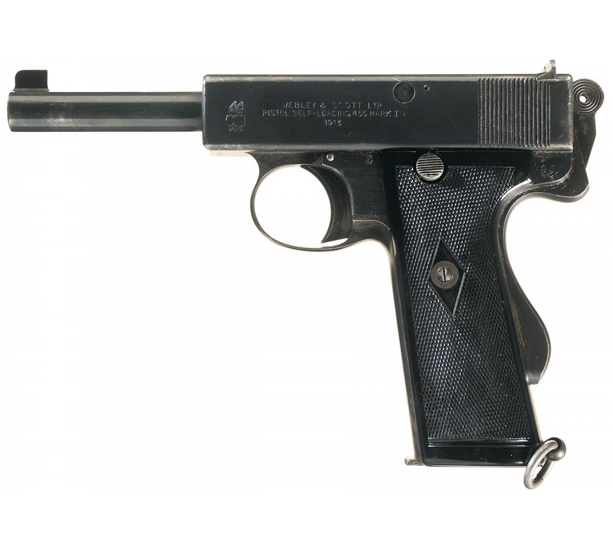 The Model 1913 was the result of years of development in conjunction with the British government and was finally adopted as the Model 1913 MK 1N for Royal Navy issue. The left side of the slide is marked with the Webley & Scott winged bullet logo followed by "WEBLEY & SCOTT LTD/PISTOL SELF - LOADING 455 MARK 1 N/1913". The British broad arrow and crown proofs appear on various parts. The pistol is equipped with a fixed front sight and windage adjustable rear sight, a grip hammer safety, lanyard ring on the heel and hard rubber checkered grips.