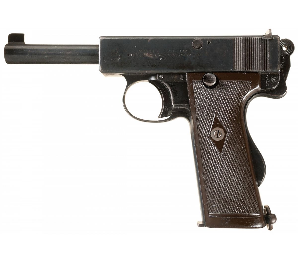 The Model 1913 was the result of years of development in conjunction with the British government and was finally adopted as the Model 1913 MK 1N for Royal Navy issue. The left side of the slide is marked with the Webley & Scott winged bullet logo followed by "WEBLEY & SCOTT LTD/PISTOL SELF-LOADING 455 MARK 1 N/1914". The British broad arrow and crown proofs appear on various parts. The matching serial number is marked on the bottom of the frame and left side of the hammer safety. The pistol is equipped with a fixed front sight and windage adjustable rear sight, a grip hammer safety, lanyard ring on the heel and hard rubber checkered grips.