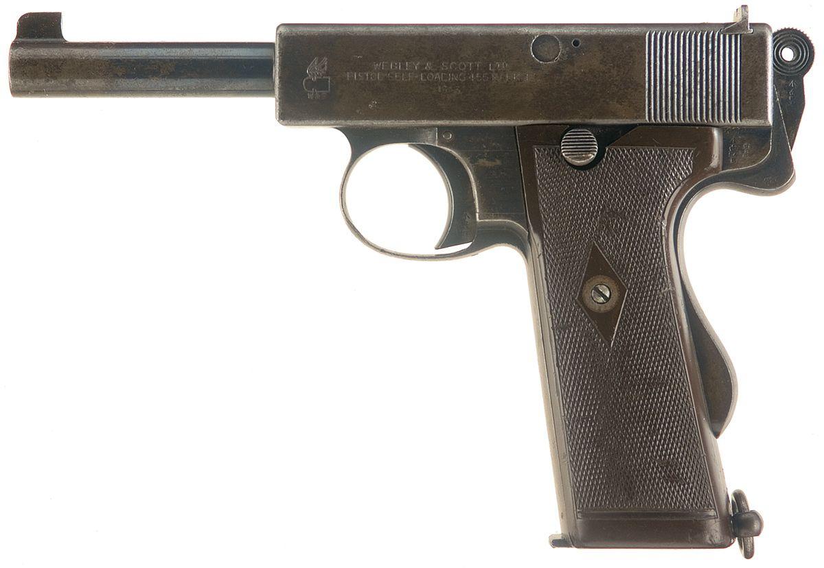 Standard military acceptance markings on top of the breech and slide, frame and hammer, 1913 dated slide, replacement smooth walnut right grip panel (missing piece at top), checkered hard rubber left grip panel, "32" marked on backstrap.