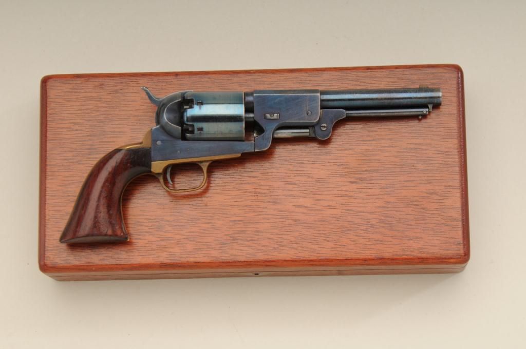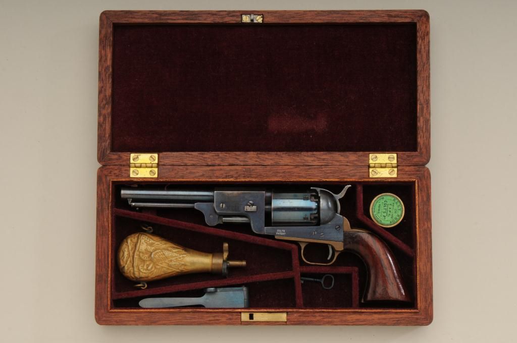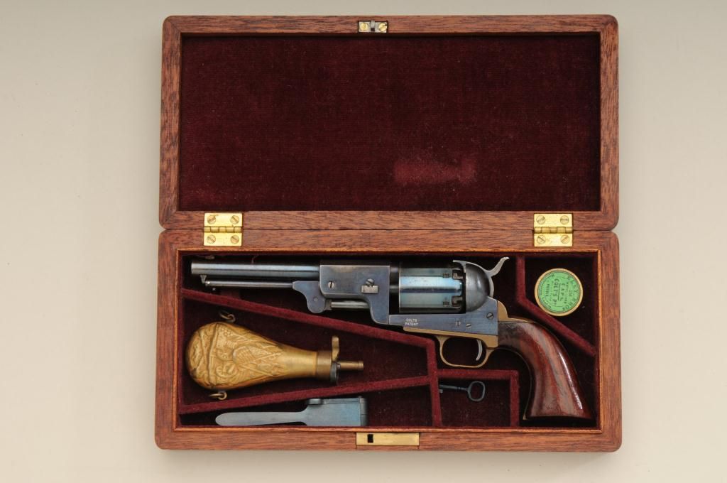 Scarce Weston miniature of Colt 3rd model Dragoon cased with accessories showing Colt markings and patent. The miniature measures 5 ¾” overall with 2 ¾” barrel. The condition is fine to near excellent showing some slight drifting to the finish. The Dragoon by Weston is quite scarce with only a few examples known to collectors. Est.: $3,000-$6,000.