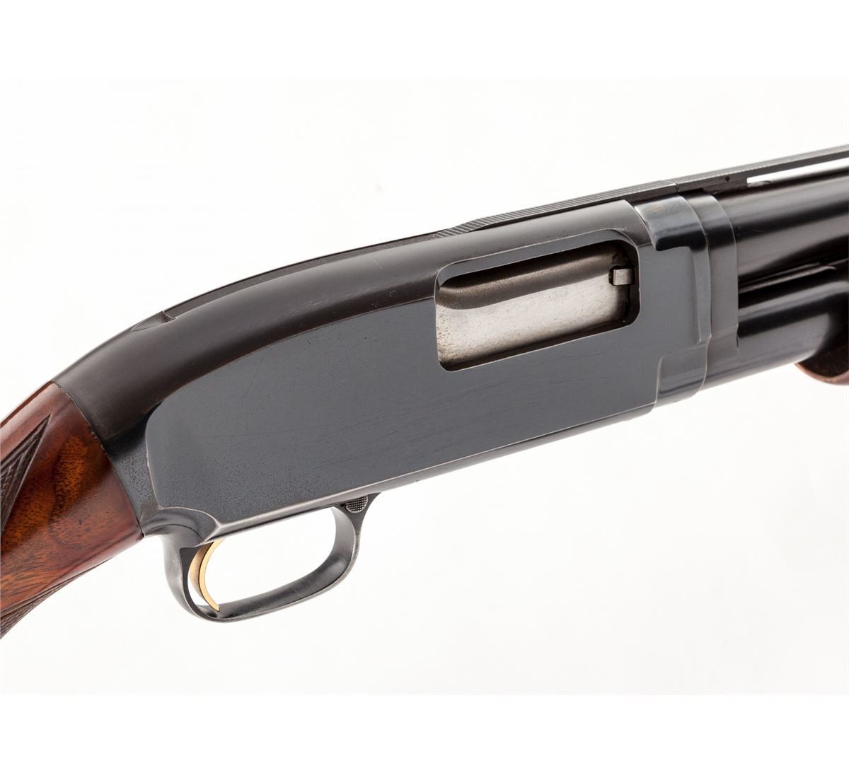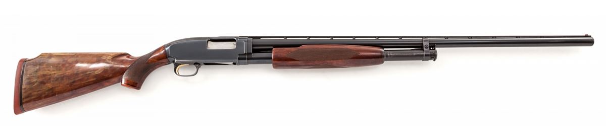 Scarce Winchester Model 12 Trap Rib Pump Action Shotgun, #1765719, 12 ga., 30'' factory vent rib barrel for 2-3/4'' shells choked Full, blue finish, factory checkered walnut stock and forend. Mfg'd 1959, with offset ''PW'' proofmarks. Condition is near excellent showing light high edgewear overall. Pistol-grip cap has been modified with 5/8'' dia. mother of pearl inlay for easy recognition at trap club. Stock shows discoloration to original varnish. Action is crisp, bore is bright. Est.: $600-$800. (C&R)