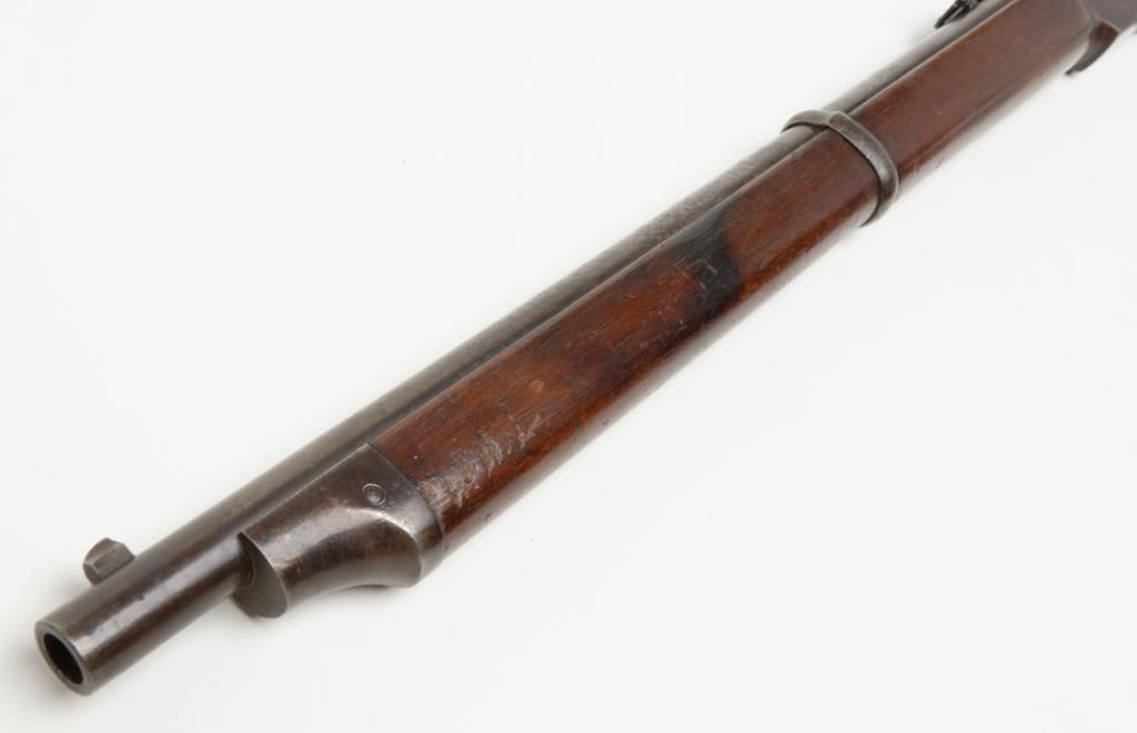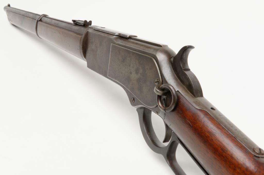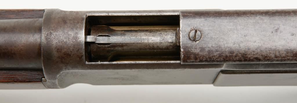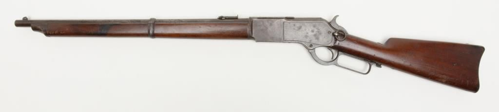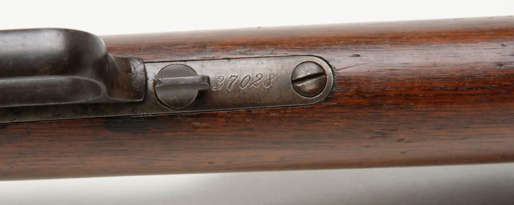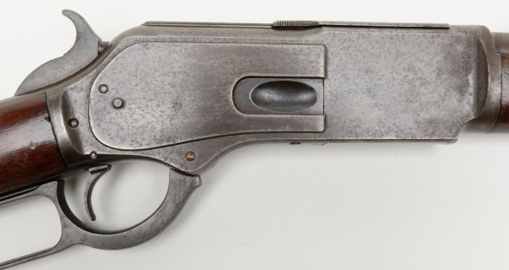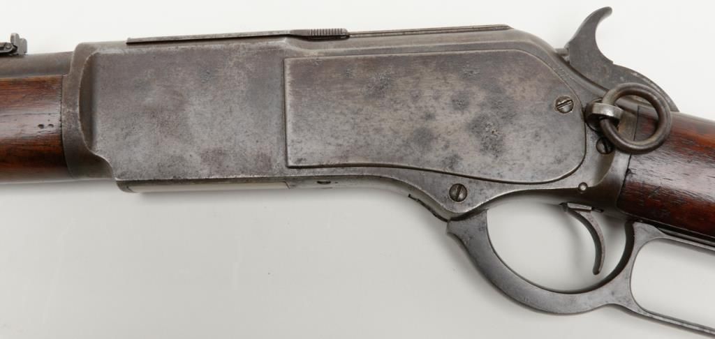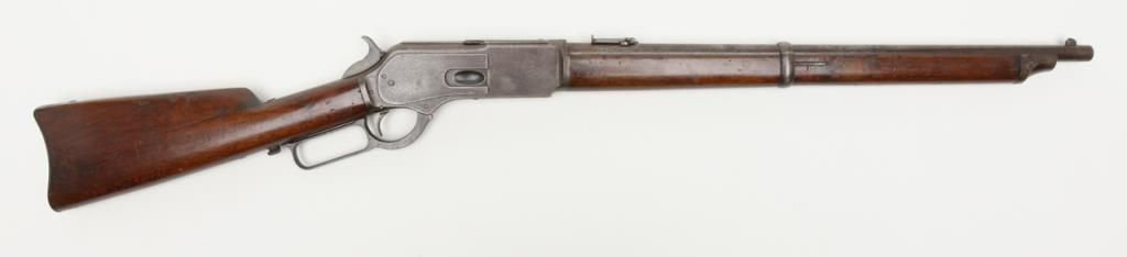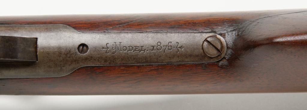 Scarce Winchester Model 1876 saddle ring carbine in .45 caliber remaining in good to very good original condition, serial number 37028. The metal surfaces show some faint traces of original blue mixed with a brown to gray patina and good visible barrel address. There are some areas of pitting on the barrel just ahead of the front band extending for an area of approximately 3” to 4” and also for 1” at the beginning of the barrel address area. The metal surfaces are otherwisegood to very good with some staining and other areas of minor scattered light to moderate pitting. The original small parts and sights are retained. The stocks are good to very good with some small imperfections, a slight crack in thecomb, minor dings, mars and scratches with normal aging. The loading gate and dust cover show some good original blue. The action is good, the bore is fair to good and may clean Est.: $3500-$7000