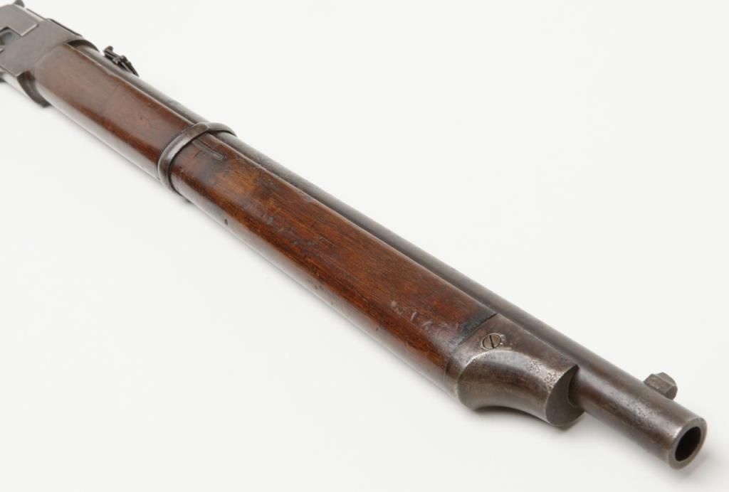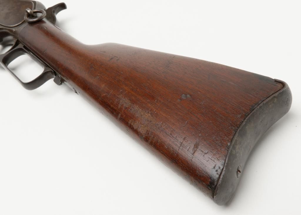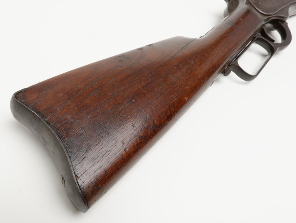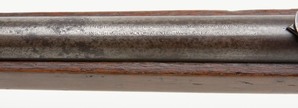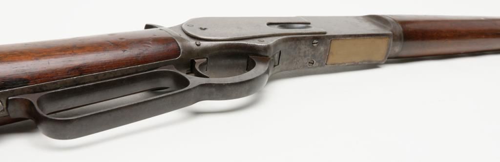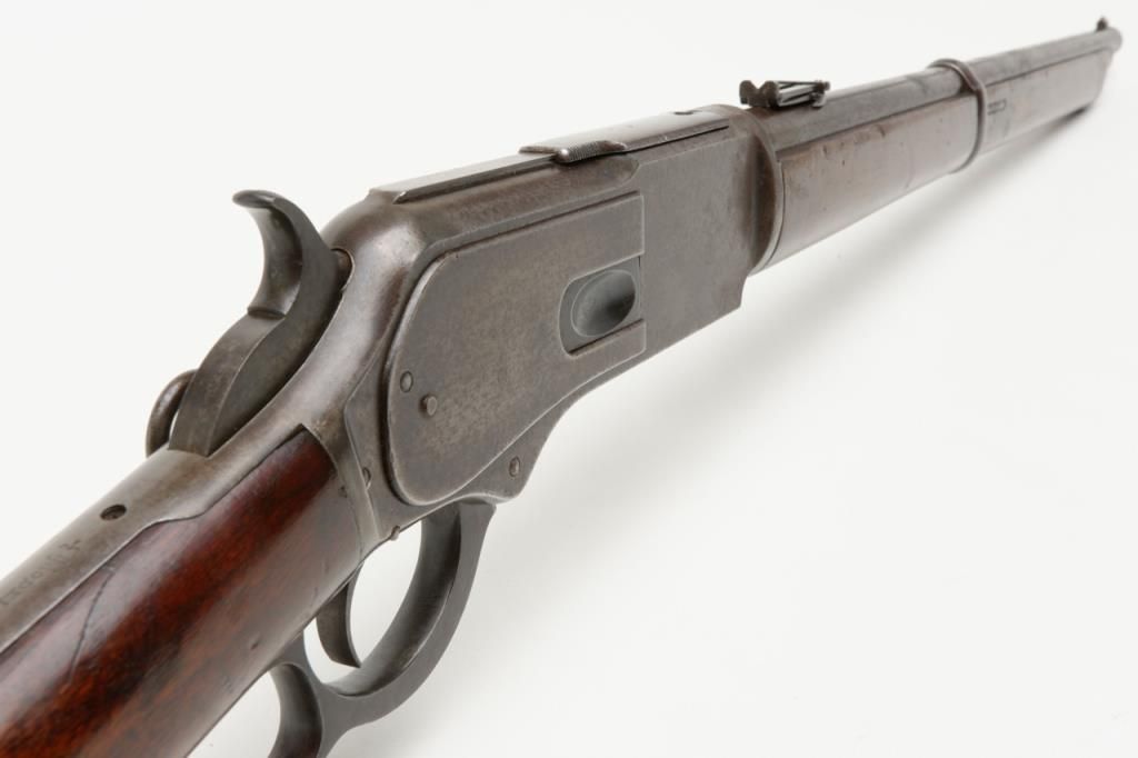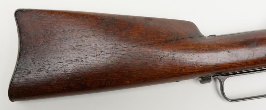 Scarce Winchester Model 1876 saddle ring carbine in .45 caliber remaining in good to very good original condition, serial number 37028. The metal surfaces show some faint traces of original blue mixed with a brown to gray patina and good visible barrel address. There are some areas of pitting on the barrel just ahead of the front band extending for an area of approximately 3” to 4” and also for 1” at the beginning of the barrel address area. The metal surfaces are otherwisegood to very good with some staining and other areas of minor scattered light to moderate pitting. The original small parts and sights are retained. The stocks are good to very good with some small imperfections, a slight crack in thecomb, minor dings, mars and scratches with normal aging. The loading gate and dust cover show some good original blue. The action is good, the bore is fair to good and may clean Est.: $3500-$7000