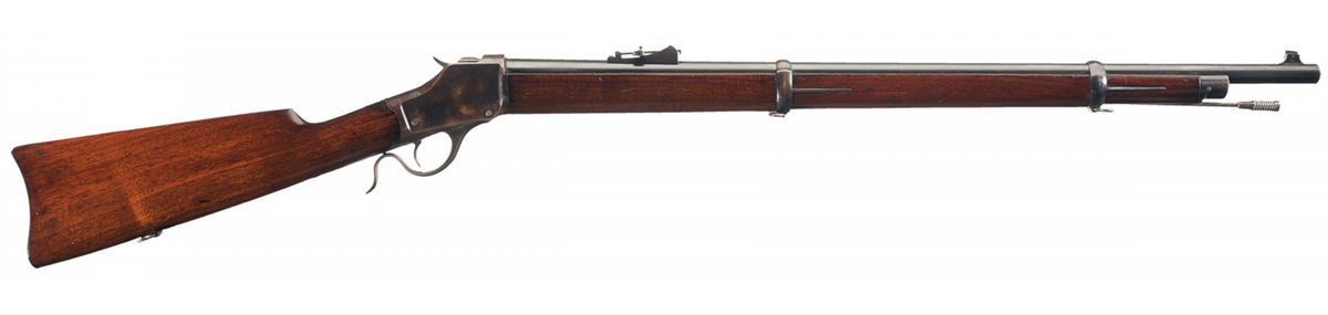 Manufactured in 1918. Standard two line address/patent date on the top of the barrel between the barrel bands and "22 LONG R." at the breech. High ramped blade front sight and adjustable ski slope rear sight. "PAT. OCT. 7 TH 79,/WINCHESTER/TRADE MARK" marked upper tang and the serial number is marked on the lower tang. Mounted with a smooth full length walnut forearm with steel end cap and straight grip stock with carbine style buttplate and sling swivel. There is a sling swivel mounted on each barrel band and the rifle is complete with a steel cleaning rod with serrated and slotted head.