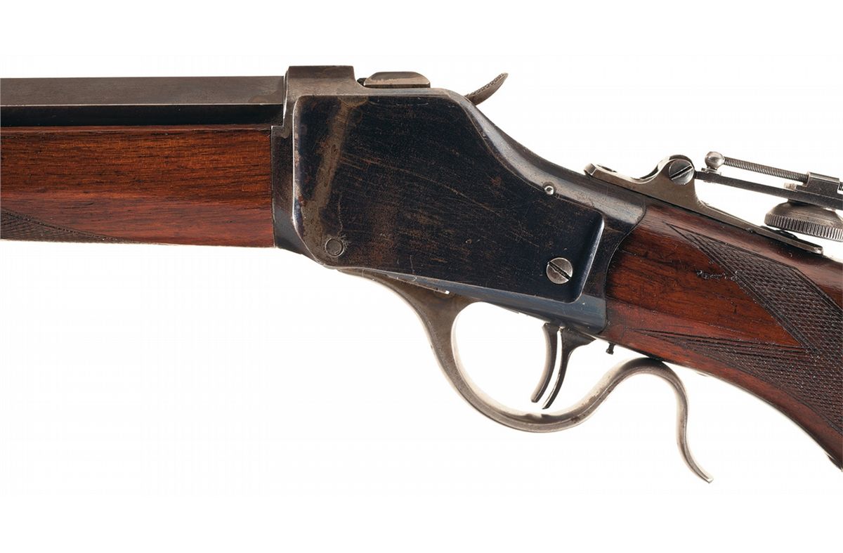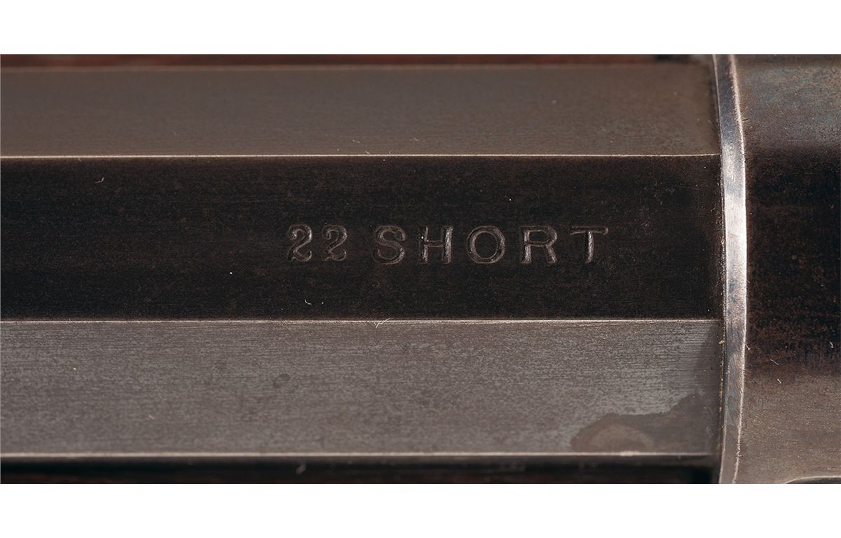 This is an excellent example of a semi-deluxe or special sporting rifle in the very desirable 22 short caliber. These rifles are a pre-Schuetzen target rifle with this example being made in late 1900 or early 1901. This model has several special order features such as the pistol grip stock with Winchester grip cap, factory checkering on both the pistol grip area of the stock and forend, small Winchester Swiss-style double prong buttplate and close-coupled double set trigger. The rifle has been fitted with a number 3 weight full octagon barrel that is marked "MANUFACTURED BY THE/WINCHESTER REPEATING ARMS CO. NEW HAVEN CONN. U.S.A.", on the top flat ahead of the rear sight dovetail and "22 SHORT" at the breech. The lower tang behind the trigger is marked "PAT. OCT. 7TH 79", with the serial number "89389" on the rear of the tang. Winchester globe front sight, filler block in the rear sight dovetail and a modern replacement mid-range target style vernier rear sight that's adjustable for both windage and elevation and has an unmarked eye-cup.