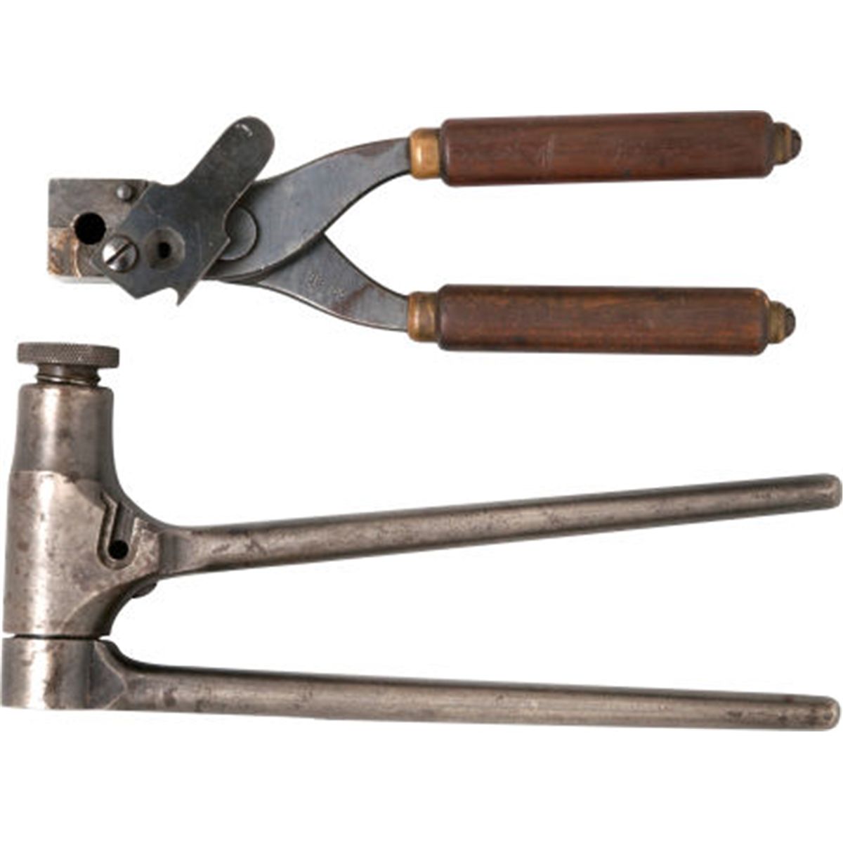 Scarce Winchester Model 1891 No. 5 .38-55 Caliber Reloading Tool Together with Single-Cavity Bullet Mold. Comprising the scarce Winchester Model 1891 No. 5 .38-55 caliber bullet mold with threaded chamber. Top arm marked: Manufactured By The/Winchester, Repeating Arms Co./New Haven, Conn. U.S.A./Pat. March 17, '91. On to top of chamber, the legend reads: "Keep The Die Clean"/.38-55. Sold together with a single-cavity block bullet mold, marked on side of block: Manufactured By The/Winchester Rep. Arms Co./New Haven Conn.U.S.A. Blued finish. Wooden handles. Condition: 1) Very good. Metal with grey patina and scattered wear overall. Traces of blue in protected areas. 2) Excellent. Retaining approximately 90-95% finish with scattered light wear present.