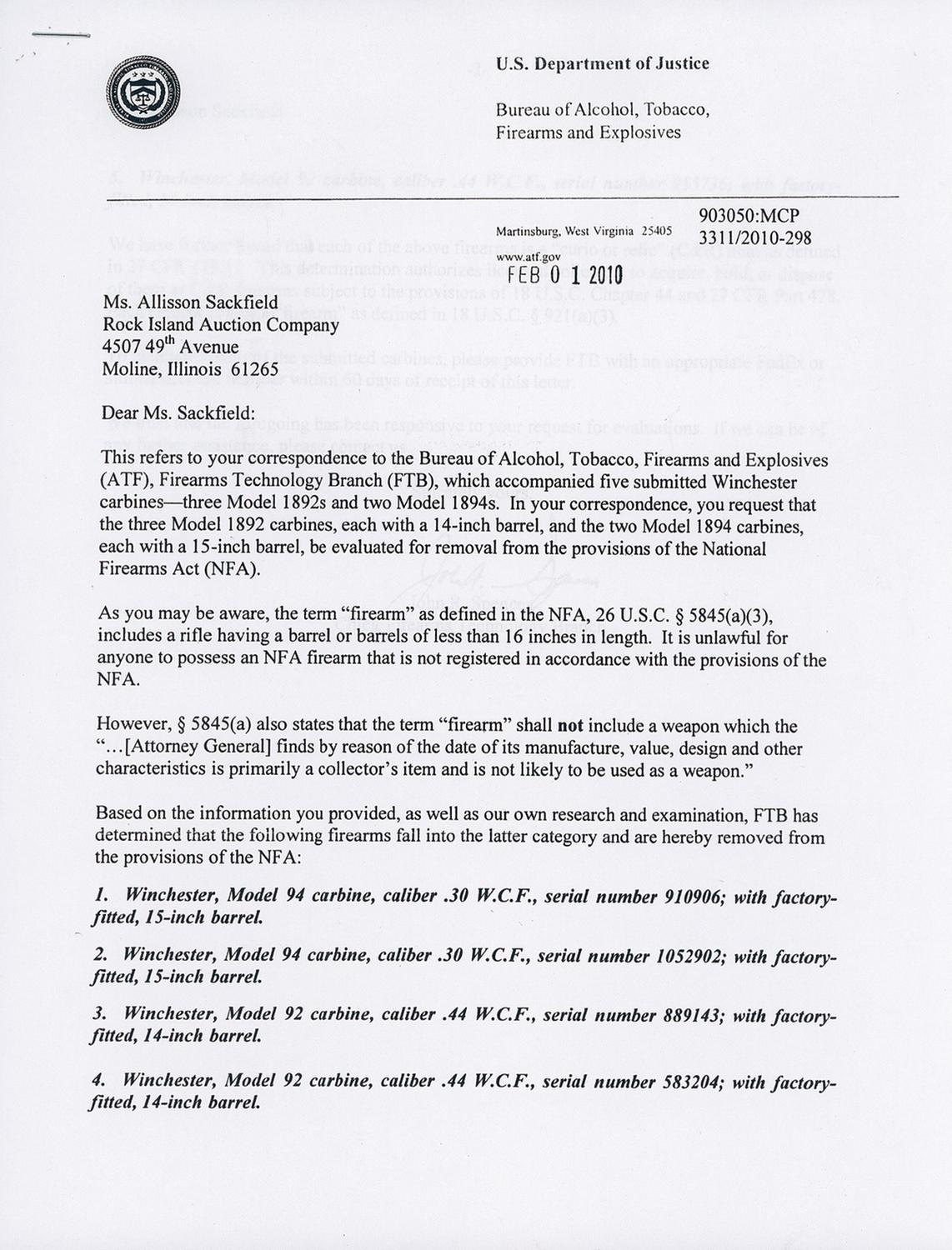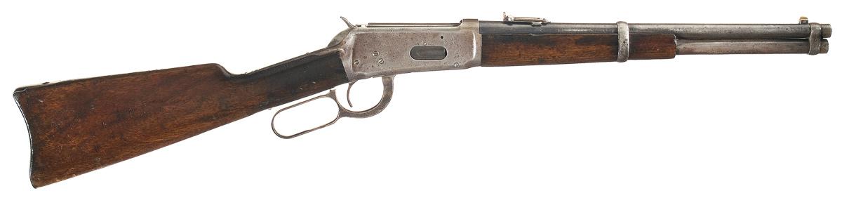 Manufactured in 1922. Blade front sight and folding rear sight graduated to 2,000 yards. The left side of the barrel is marked with the two line address/patent date marking ahead of the barrel band and the two line nickel steel marking and "30 W.C.F." to the left of the rear sight. The upper tang is marked with the three line model, make and trademark information and a saddle ring stud with ring is mounted on the left side of the frame. It has a full tubular magazine, smooth forearm and straight grip stock with a carbine style buttplate. Accompanied by a letter from the Bureau of Alcohol, Tobacco, Firearms and Explosives dated Feb 01 2010 listing this carbine as one of five carbines being removed from the NFA (National Firearms Act) and classified as a curio and relic.