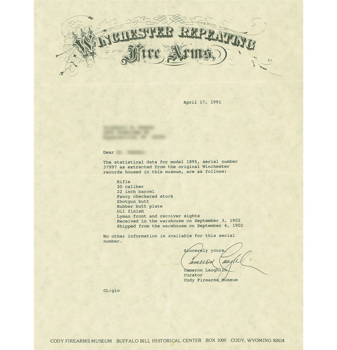 Cody letter verifies the serial number, rifle configuration, caliber, barrel length, fancy checkered stock, rubber buttplate, oil finish, front and receiver Lyman sights, that it was received in the warehouse on September 3, 1902 and shipped out the next day.