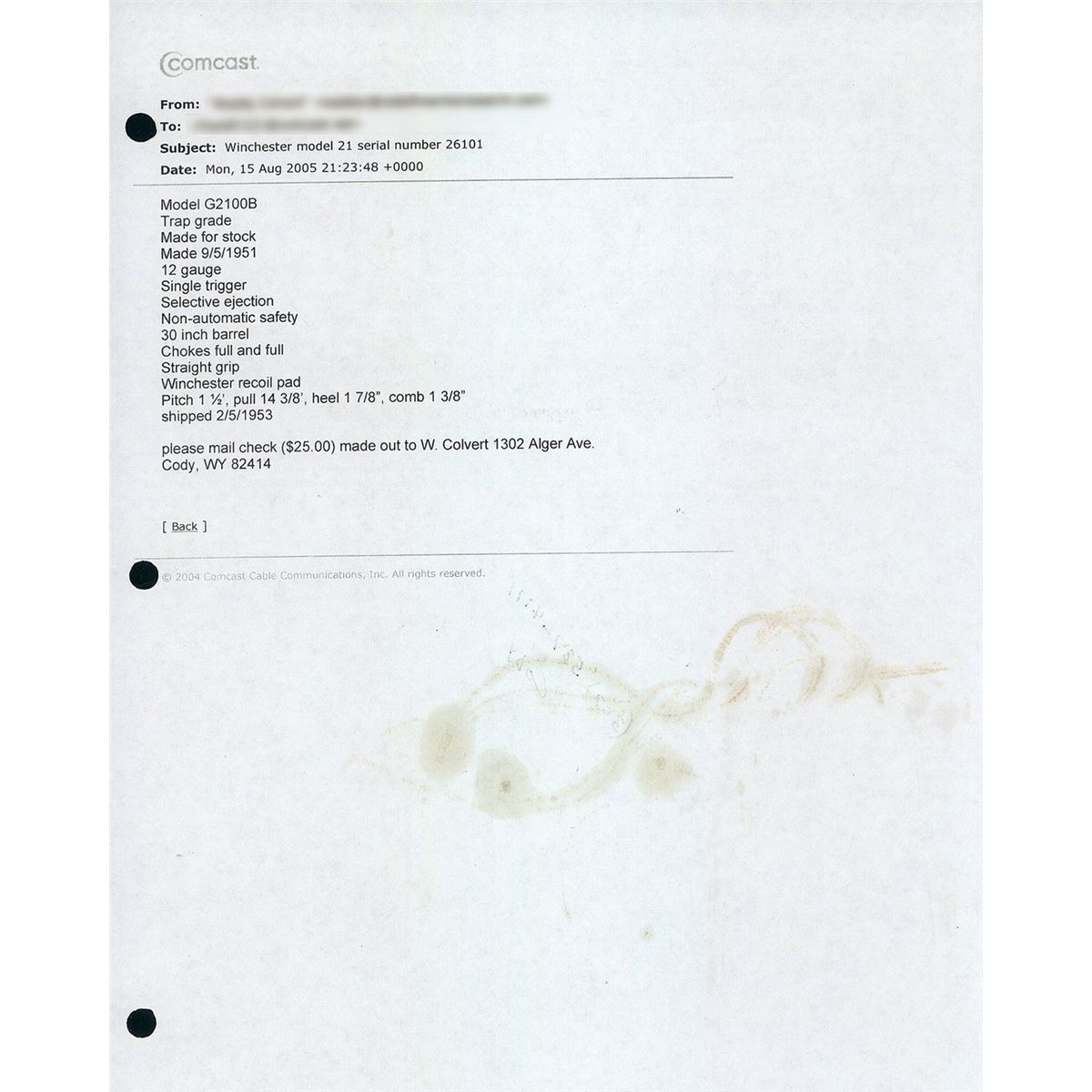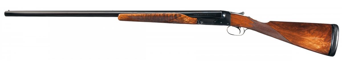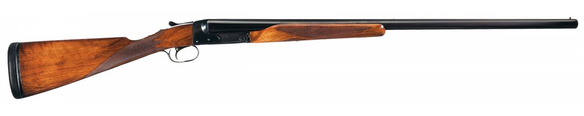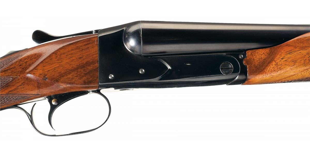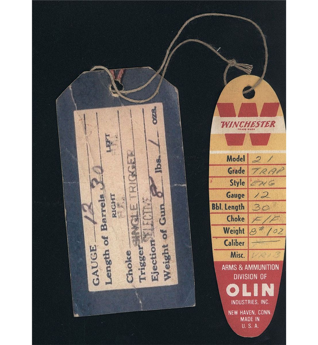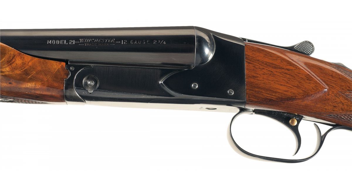 The Model 21 was introduced in 1931 and proved itself to be strong and reliable with excellent quality. This Trap Grade shotgun has a brass bead front and steel mid bead sights on the matte concave solid rib, choke full/full and 2 3/4 inch chambers with ejectors. The left barrel is marked at the rear "MODEL 21--WINCHESTER--/--TRADE MARK--- 12 GAUGE 2 3/4", the bottoms are marked "WINCHESTER PROOF STEEL" and "FULL" and the flats are marked with the Winchester oval proof and matching serial number. The water table is marked with the oval proof on the right side and the model designation and address on the left side. The trigger plate is marked "TRAP". Has a single selective trigger and tang mounted safety. Mounted on a nicely figured multi-point checkered walnut beavertail forearm and straight grip stock with leather covered recoil pad. Length of pull is 14 inches. The shotgun is accompanied by an email from Cody Firearms Research verifying the serial number, Trap Grade, that it was manufactured 9/5/51 (for stock), gauge, selective trigger, ejector, manual safety, chokes, barrel length, straight grip stock with a Winchester recoil pad, stock dimensions (length of pull 13 3/4") and that it was shipped on 2/5/1953. The shotgun also comes with the original hanging tags.