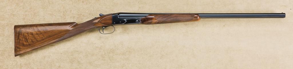 Scarce Winchester Model 21 factory Skeet marked 16 gauge Double Barrel Shotgun with 26” bbls, select checkered wood stock, English style strait grip, Beavertail forend, checkered butt, single trigger, auto ejectors, serial #15461, choked WSI-WSII. The gun remains in near fine condition with 90-95% original blue, some drifting to plum patina on collar of forend and trigger guard but generally near fine overall with razor sharp knurling on matted top rib and excellent bores. The stock is also fine to excellent with just some slight storage scratches. The interior numbers all match and this is a factory original skeet which was only produced about 2-3 years in this gauge and configuration. Est. $5,000-10,000