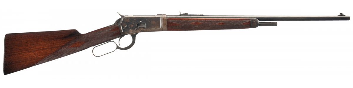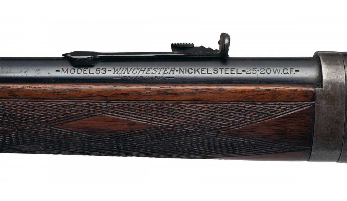 Winchester manufactured only about 25,000 Model 53s from 1924 to 1932. This model was in fact a slightly more modern version of the Model 1892. It was available in only one style, the Sporting Rifle with a 22" tapered barrel. This rifle was manufactured in 1928, and features a blade front sight with brass bead and adjustable sporting rear sight and half magazine. The barrel is marked with the two line address on the right rear, model, trademark, caliber designation and "NICKEL STEEL" on the left side and standard three line trade mark marking on the upper tang, the Winchester oval proof on top of the barrel and receiver at the breech and the serial number on the bottom of the receiver. Mounted with a custom multi point and diamond pattern checkered walnut forearm and straight grip stock with serrated shotgun buttplate.