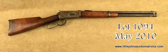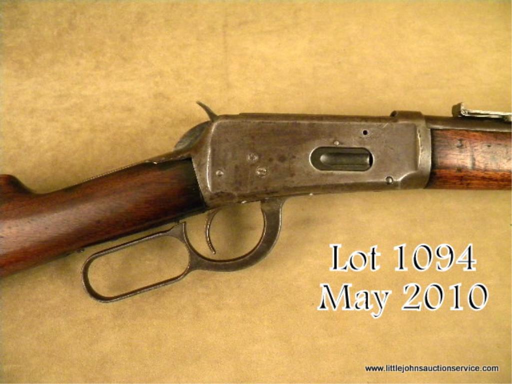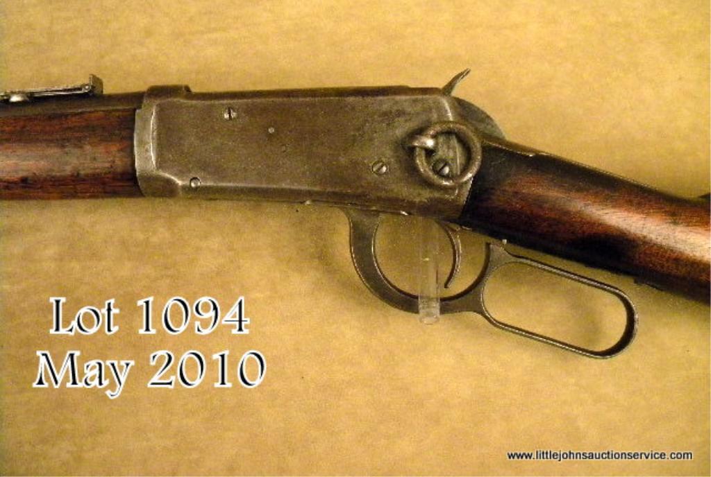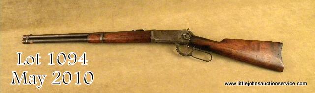 Scarce Winchester model 1894 carbine in .38-55 caliber with all features standard on carbine, serial #222399. The carbine remains in fair to good original condition showing traces of original blue mixed with some traces of brown patina. Onthe barrel shows some light erosion and surface pitting. The markings are good, the stocks are fair to good showing some small losses, compression crack in the forend, some light cleaning, and coating of clear varnish. Action issomewhat loose, bore is fair to good. An early carbine in a desirable caliber. Est: $800 - $1,600