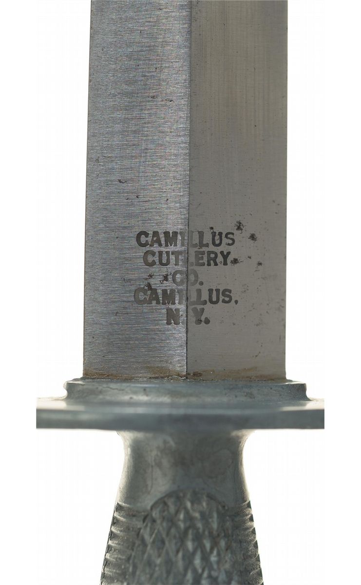 1) Camillus/USMC Raider Stiletto. Produced for the 1st Marine Division and the 1st and 2nd Marine Raider Battalions. 12 1/4 inches overall, with a 7 1/4 inch double edged spear point blade, with an etched "USMC" banner and makers marks on one side. Zinc alloy checkered grip and oval guard. With a brown leather sheath. 2) Fairbairn-Sykes Fighting Knife. Measuring 11 1/2 inches overall, with a 6 7/8 inch double edged spear point blade, steel oval guard with "I/broad arrow" and "ENGLAND" markings, and a ribbed cast brass hilt with "3" on the back. With a brown leather sheath with brass reinforced tip.