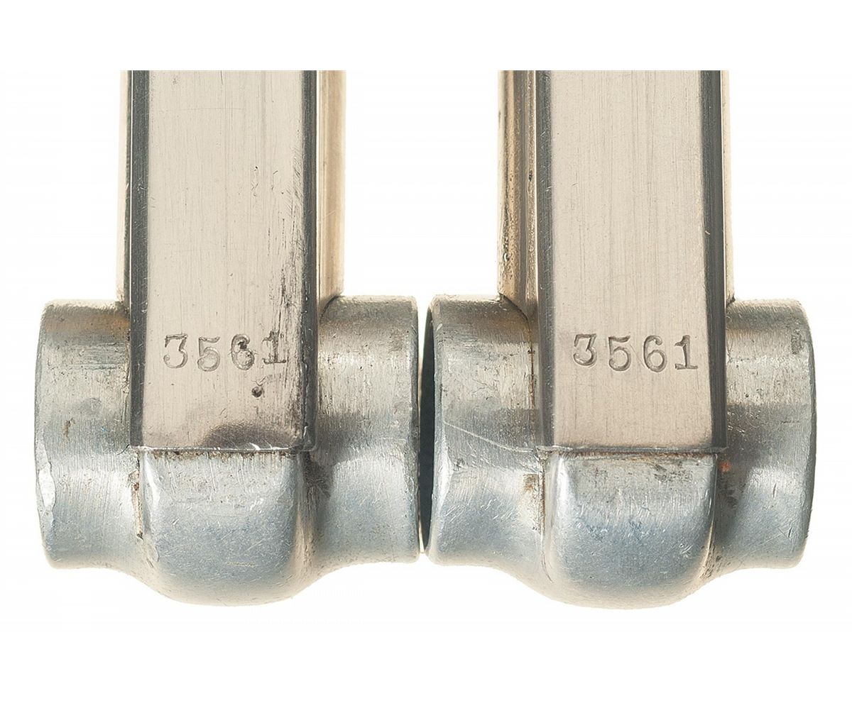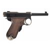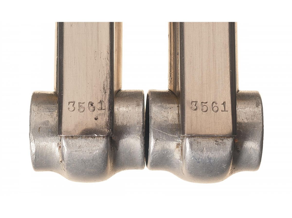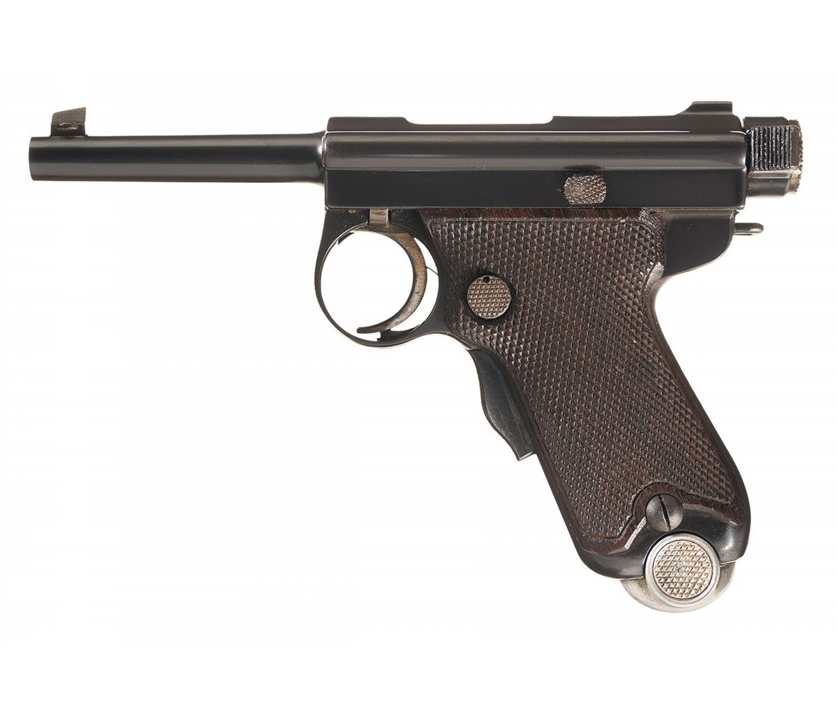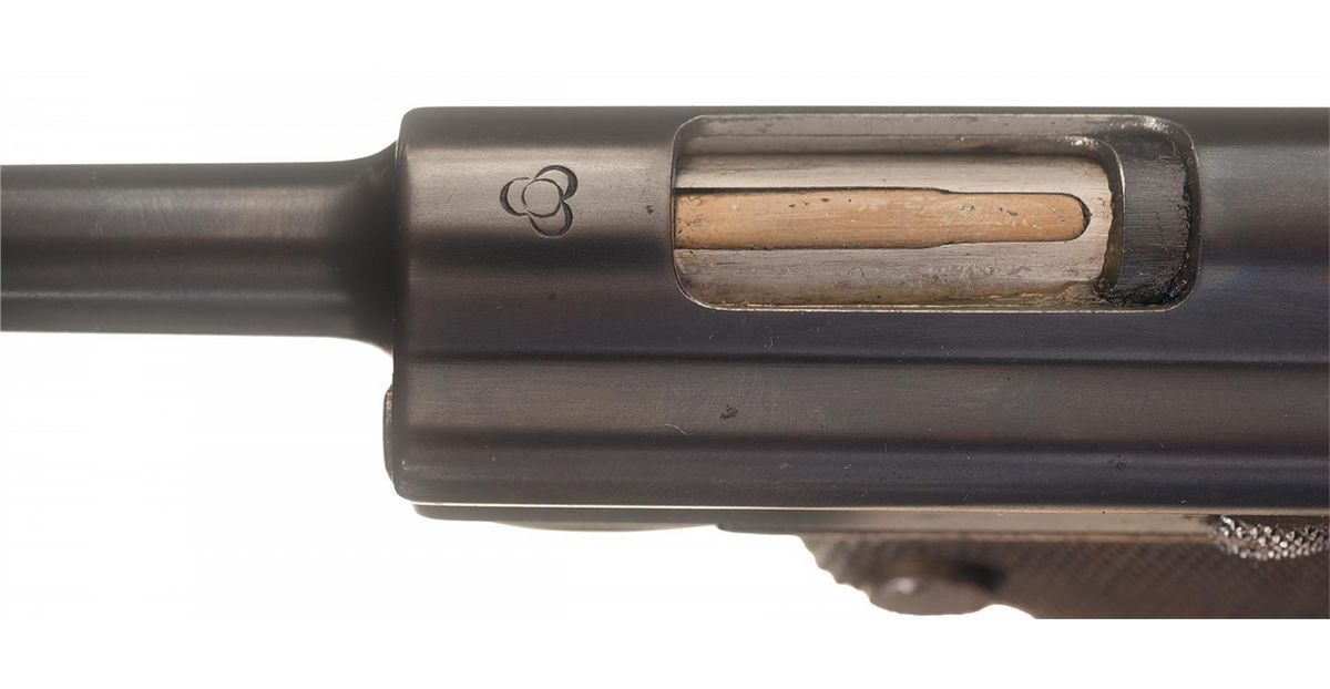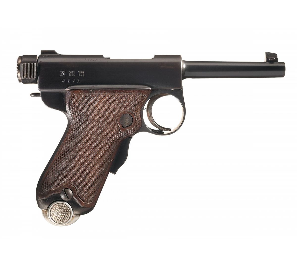 This is a an excellent example of a pre-war Japanese Baby Nambu pistol as manufactured by the Tokyo Koishikawa arsenal. This pistol has a high quality rust blue finish and straw colored trigger, magazine release, sear pivot pin and bolt lock with a bright finished bolt, and checkered mahogany grips. The magazine has a nickel plated body with an aluminum base. The top of the chamber area bears the four intertwined cannon balls of the Tokyo Arsenal and the right side of the receiver has the Japanese Kanji markings over the serial number "3561". The matching serial numbers are also visible on the underside of the bolt, the back side of the cocking knob, the back of the both magazines, and on the inside of the left grip panel. It is complete with an original Japanese Baby Nambu holster. The "Baby" Nambu is perhaps the most desirable Japanese semi-automatic pistol.