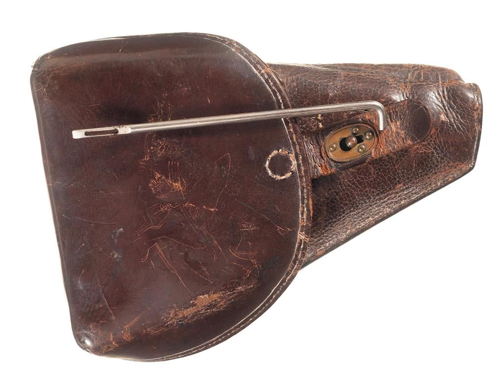 Excellent with 90% of the blue finish overall with the grip straps showing a light brown patina starting to form. The grips are excellent with nice sharp checkering and minimal handling marks. The holster is very good with a nice brown color overall showing wear and scuffing on the flap, and age cracking down the front of the holster, with a small tear on the front edge of the flap. As noted this rare pistol has matching numbers to includes both magazines.