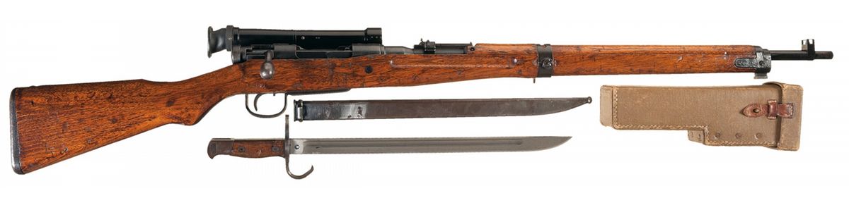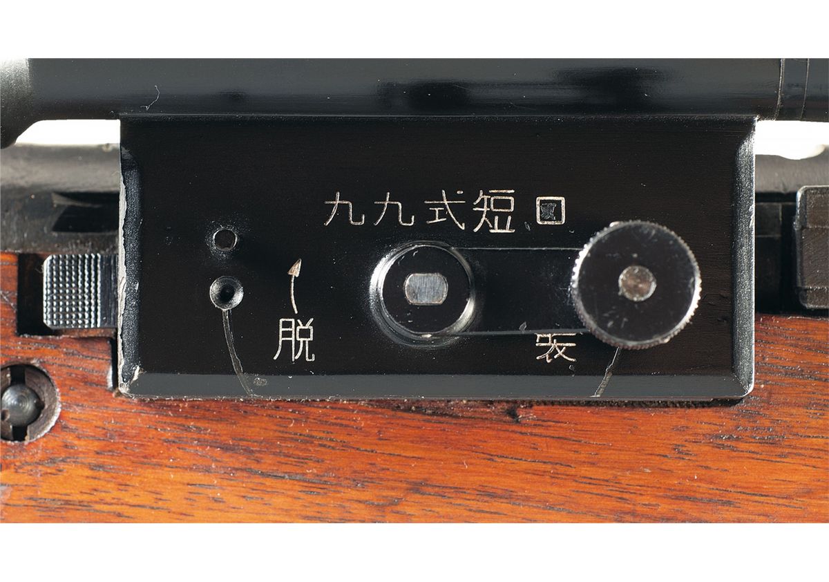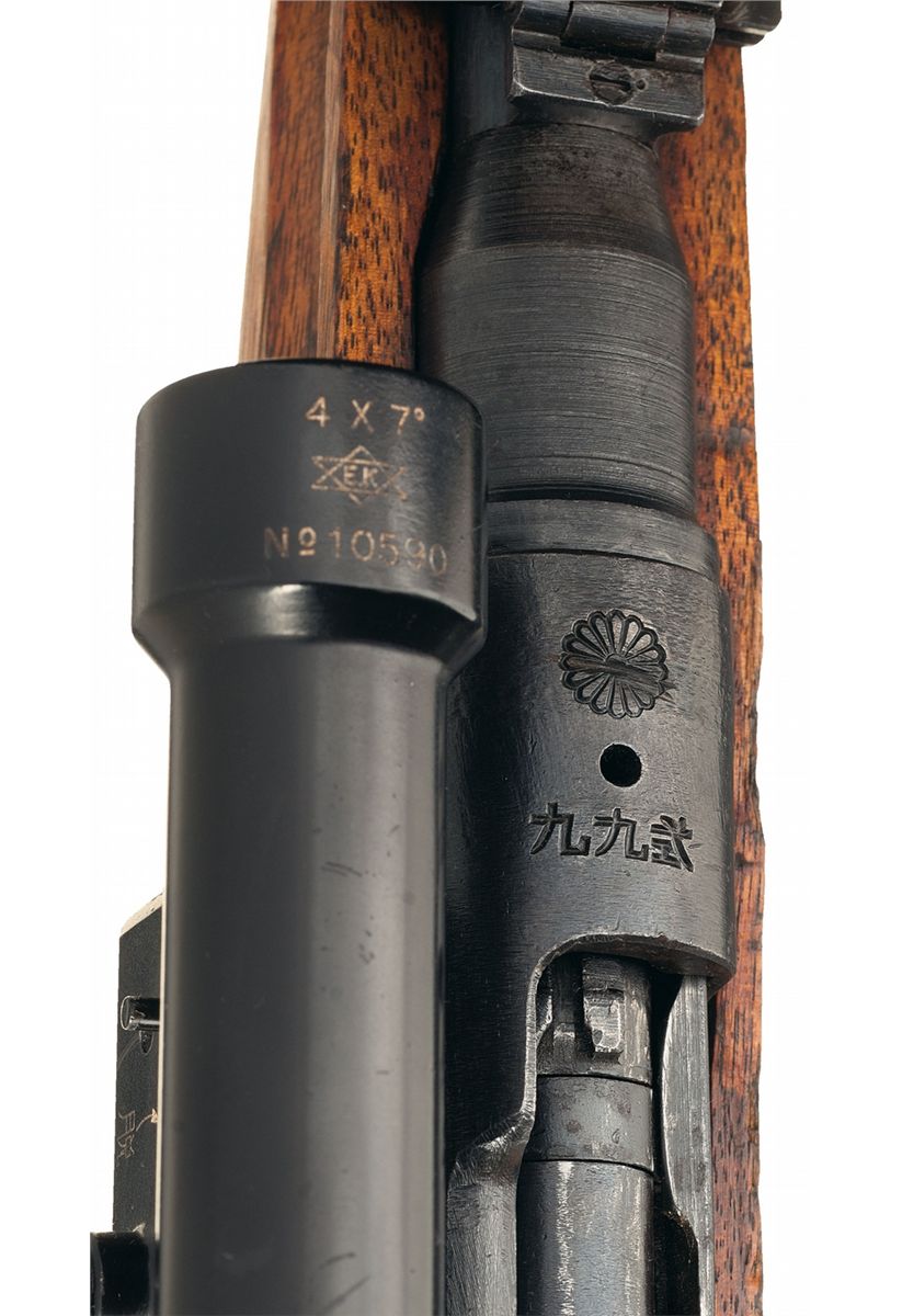 This is a very nice example of a mid-WWII Japanese Type 99 sniper rifle that was manufactured at the Toriimatsu factory of Nagoya Arsenal, that is complete with an original 4X snipe scope and original carrying case. The rifle itself it the standard type 99 that has the adjustable tangent rear sight with peep that was produced without the antiaircraft wings and is graduated from 3-15 (300-1500 meters) that has the inverted "V" front sight with the guards. The chrysanthemum on top of the receiver ring is intact, but has been struck once across it and the Kana markings are intact. The rear receiver ring has the Nagoya arsenal proof over the serial number (4637). It has the late war style stock with no drain hole, the cupped buttplate and side mounted sling swivels. The scope is an original 4X internally adjustable model that is marked on front portion of the tube, 4 X 7/EK inside a double invert triangle/No.10590", with Kana markings on the lower left side of the scope base. The rear locking plate is stamped with number "1403". The reticle has the large grid pattern cross-hairs that is calibrated from 1-15 (for 100-1500 meters) elevation below the center line, with 20 degrees wind deflection on either side of the center line. The scope is complete with an original canvas scope case for the standard 4X scope. This rifle has an original matching turned down sniper bolt with a matching extractor, cocking knob, front barrel band and a unnumbered firing pin. This fine rifle is complete with early Type 30 hook bayonet, with the polished blade and steel scabbard. The blade is marked with the Kokura Arsenal symbol.