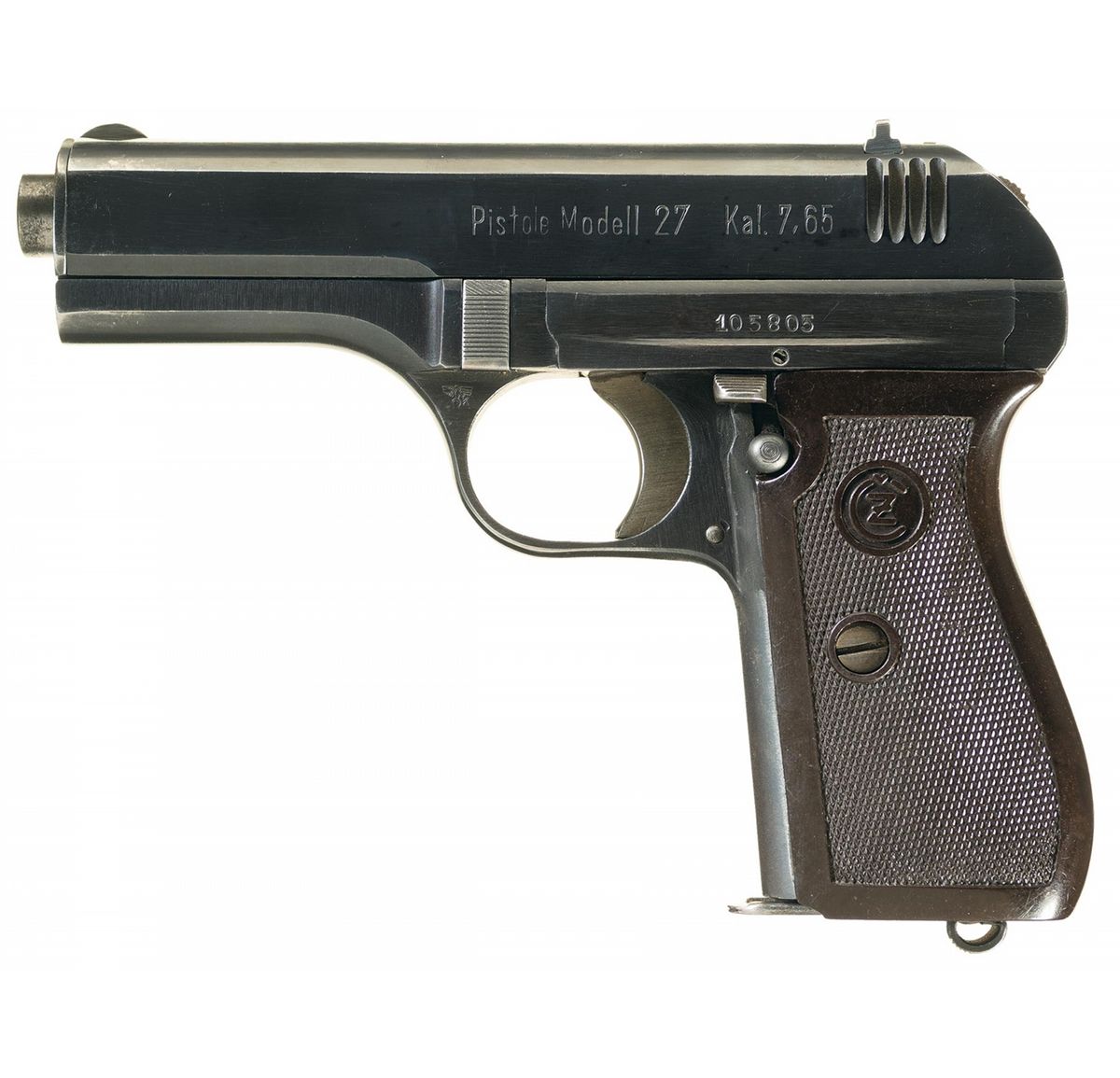 This is a standard CZ model 27 pistol manufactured under the German occupation from 1942-1945 at the BRNO factory in Czechoslovakia. This standard issue sidearm has the desirable Police "Eagle/K" proofmark on the left trigger guard and "42" on the right. The left side of the slide is marked "Pistole Modell 27 Kal. 7.65" with the top marked "BOHMISCHE WAFFENFABRIK A.G. IN PRAG". It has the serial number stamped on the left side plate and also the right front side of the frame. The right side of the frame and chamber area of the barrel, both carry a standard Rampant Czech Lion proofmark, without Nazi proofmarks, except for the Eagle/K proof. This pistol is complete with one original CZ 27 marked matching magazine.