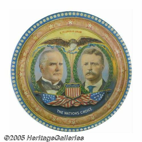 <B>Scarce and Colorful 1900 William McKinley / Theodore Roosevelt Jugate Litho Tin Tray</B></I> This gorgeous multi-color tray is a very tough design, especially in such beautiful condition. Some extremely trivial fine speckling, noticeable only under the closest inspection, is noted only for strictest accuracy. Diameter 10". Lot:260