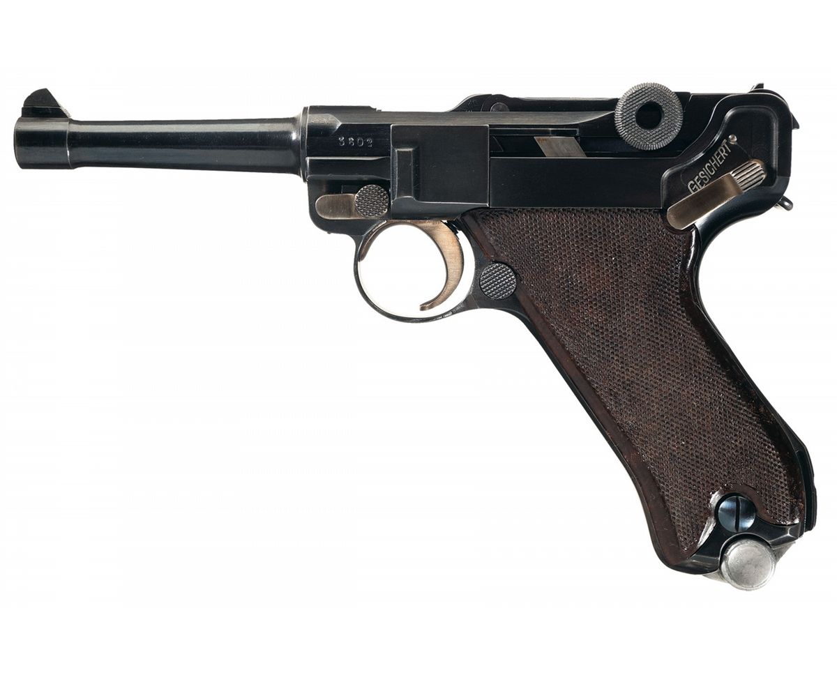 Manufactured in limited quantities for the Luftwaffe, this is an attractive example of a pre-WWII Krieghoff "S" Code Luger. This Luger is marked with the early "S" Code over the chamber which was the secret wartime code indicating manufacture in 1936 and is a mid-production model with serial number "3602". There were only an estimated 4,000 "S" Code Lugers produced during this year of manufacture. The Luger has standard features that include the C-1 die marked toggle that has the "H" Krieghoff Anchor "K" with "KRIEGHOFF/SUHL" marked below that. The left point of the anchor nearly touches the letter "H" and the word "SUHL" is slightly off-set so that the "I" in Krieghoff is slightly ahead of the letter "S" in SUHL with the flat bottom on the letter "U". The barrel extension is marked with the early "LWaA" 1st-stage 1 early Luftwaffe acceptance proof along with the Luftwaffe test proof and small "Eagle/2" proof on the right side. The barrel underside has the bore diameter, early "Eagle/2" acceptance proof and the small size full serial number. Typical military style serial number placement with the full serial number on the front frame, barrel and left side of the barrel extension with the last two digits on the various small parts. Fitted with original Krieghoff brown checkered plastic grips with the small fine checkered pattern with the smooth border around the edge of each grip panel as manufactured by the Ritzmann firm. The back side of each grip panel has the correct mold numbers that consist of a small circled "HRS" (Herman Ritzmann & Sohne Company) and the impressed number "8964". The pistol has one original matching Krieghoff magazine that has the nickel plated magazine body with cast aluminum base. The side of the magazine body is marked with "HAENEL SCHMEISSER PATENT" with a small "Eagle L" Police proof. The aluminum base on the magazine is numbered "3602" with a single "Eagle/2" proof, stamped backwards above the serial number. The commercial leather holster is has an "eagle/2" stamped on the inside.