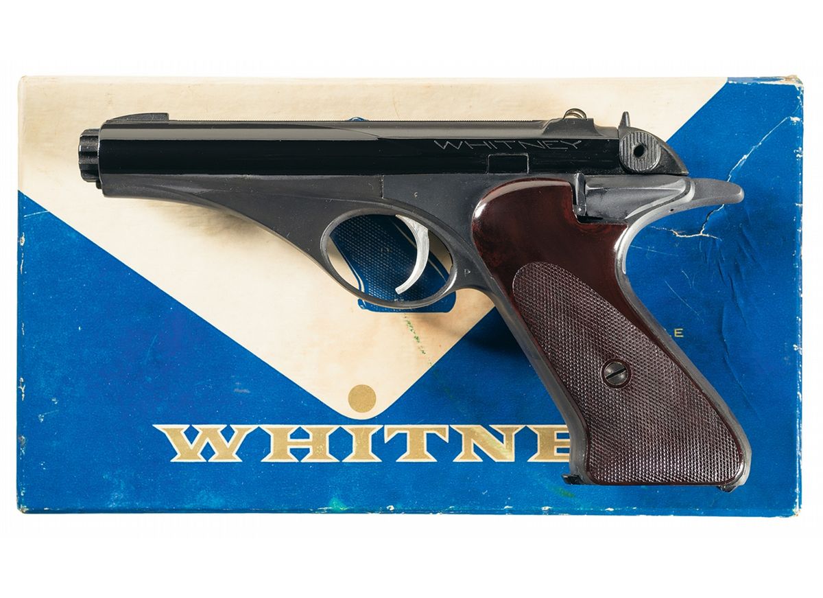 Whitney Firearms Co. manufactured 22,000 of these pistols from 1955 to 1962. It is built on an aluminum alloy frame with fixed sights, brown checkered grips and detachable 10 round magazine. The upper left rear of the frame is marked "WHITNEY" and the right side is marked with the one-line The Whitney Firearms Co. Hartford, Conn USA. Complete with the original box numbered to the gun.