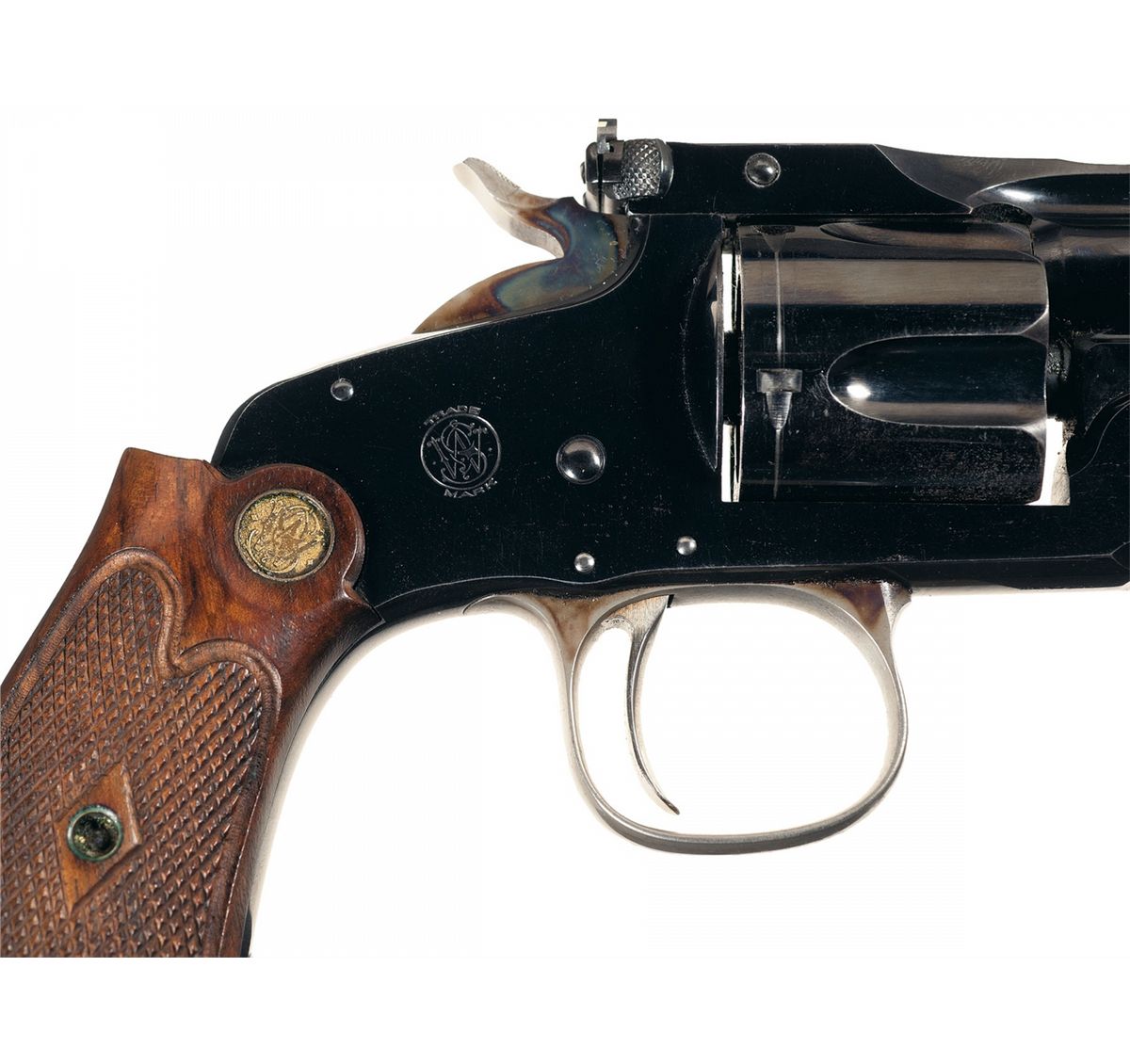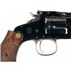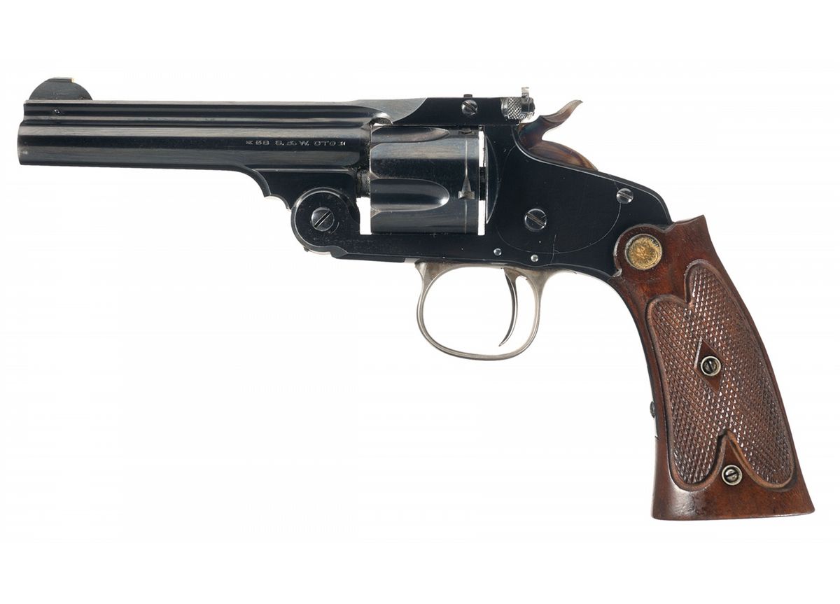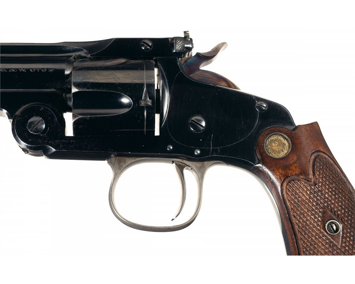 Also known as the Model of 1891, with production from 1891 to 1911. This is a scarce high condition and highly desireable target variation. Ivory bead accented Lyman front sight, with an adjustable notch rear sight integrating an ivory sighting plane. The two line, two block address and patent marks are present on the barrel rib, bisected with "MODEL of 91", caliber marking on the left side of the barrel, and matching numbers on the barrel, cylinder and butt. Casehardened wide target hammer and triggerguard, with correct Smith & Wesson First Model checkered extended grips.