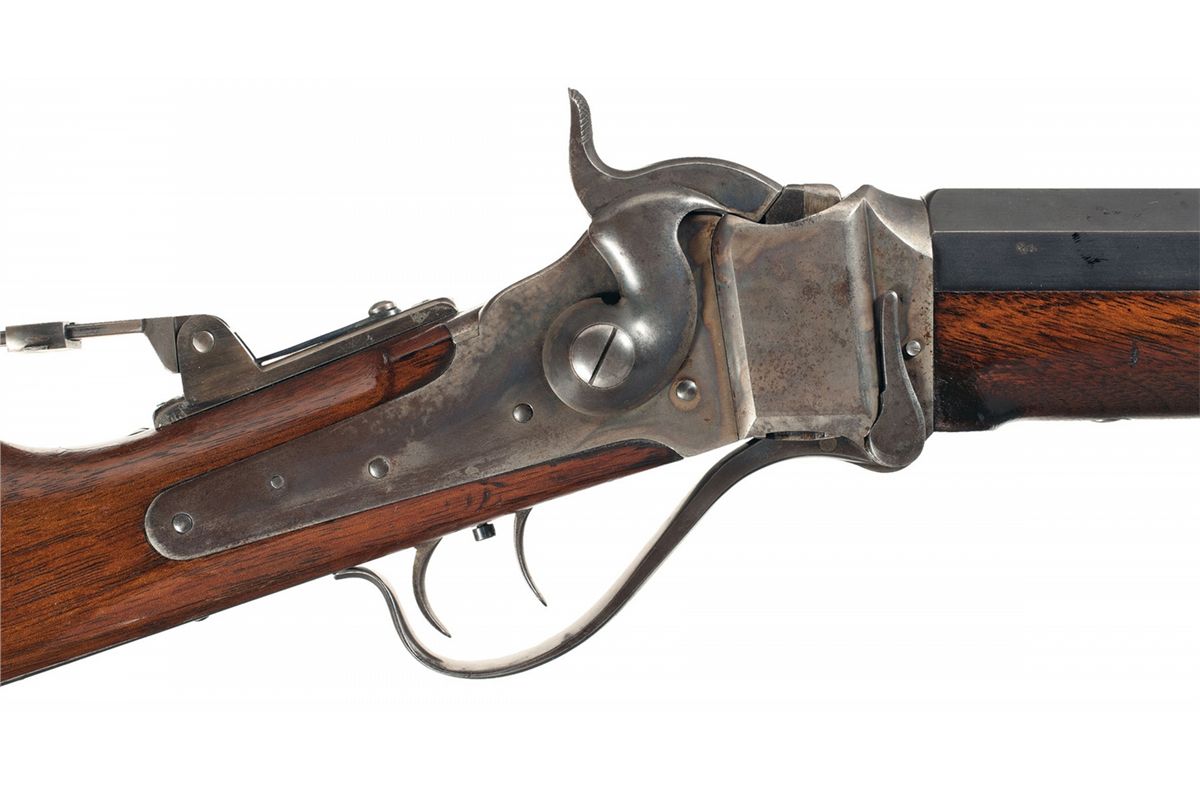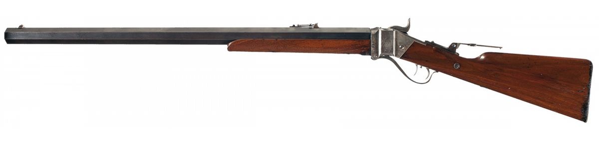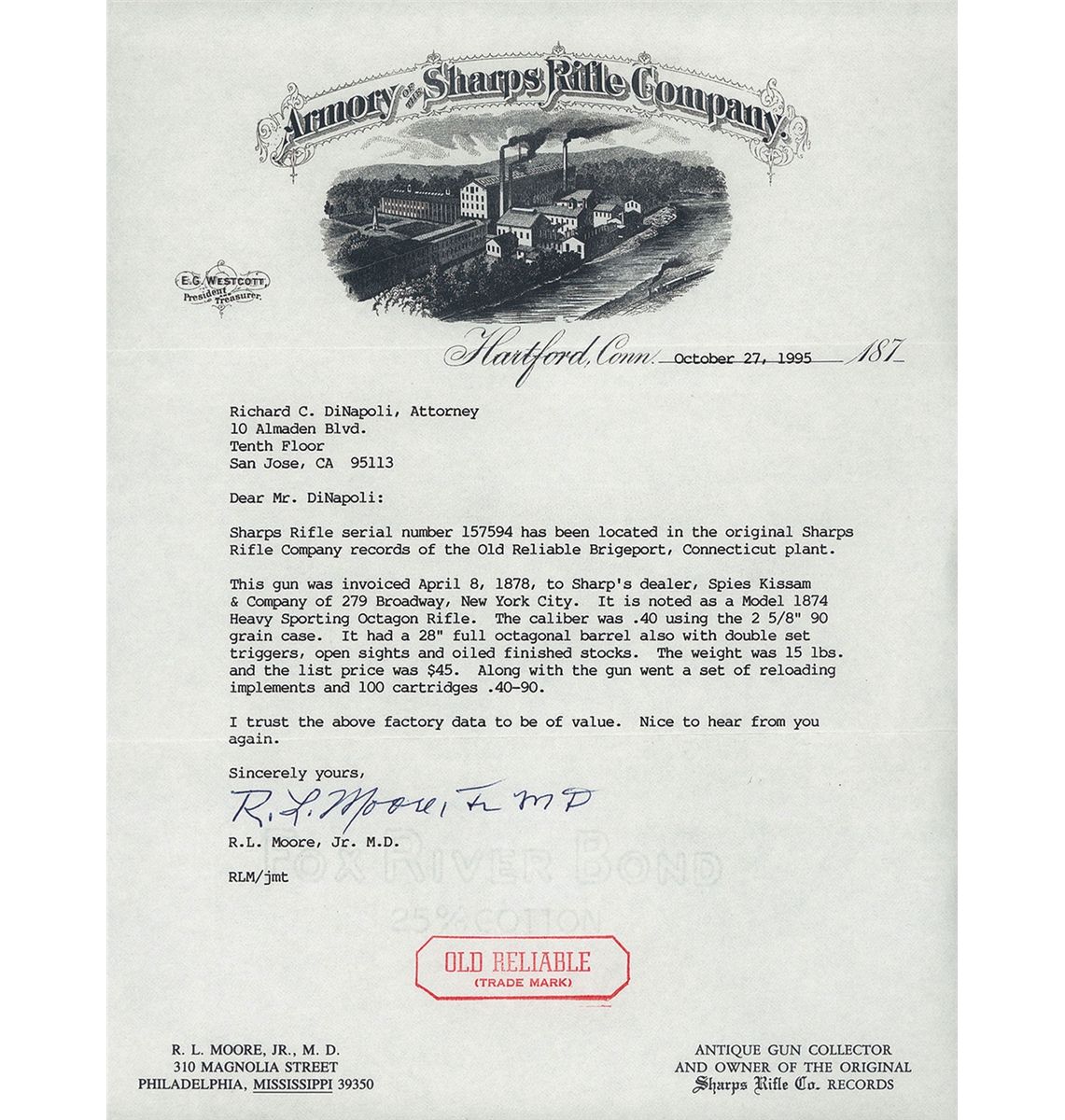 This is a nice example of a heavy barrel, 15 lbs Sharps "Buffalo Hunter" rifle. This is one of an only estimated 3,881 SharpsModel 1874 Sporting rifles made with an octagon barrel at the Bridgeport plant. The rifle is fitted with a heavy octagon barrel and equipped with special order double set triggers. The top barrel flat is marked "Old Reliable" is in an octagon box followed by "SHARPS RIFLE CO. BRIDGEPORT. CONN." ahead of the rear sight, "CALIBRE. 40" at the breech and "10 6/16" and the matching serial number on the bottom flat under the forearm. The inside of the forearm is stamped with the partial matching serial number "7594". The left side of the receiver is marked with the two line Sharps patent date and the serial number is marked on the rear. Blade front, folding ladder rear sight graduated to 800 yards and tang mounted sporting peep sight. Blue barrel, casehardened remaining parts and mounted with a smooth walnut forearm and straight grip stock with a flat checkered steel buttplate. The accompanying factory letter states that the rifle is noted as a Model 1874 Heavy Sporting Octagon Rifle, 40 caliber using the 2 5/8 inch 90 grain case, 28 inch full octagon barrel, double set triggers, open sights and oil finished stocks. The rifle was invoiced April 8, 1878 to Sharps dealer Spies Kissam & Company, 279 Broadway, New York City. The letter also notes the weight of the rifle as 15 pounds and the list price at time of invoice was $45.00.