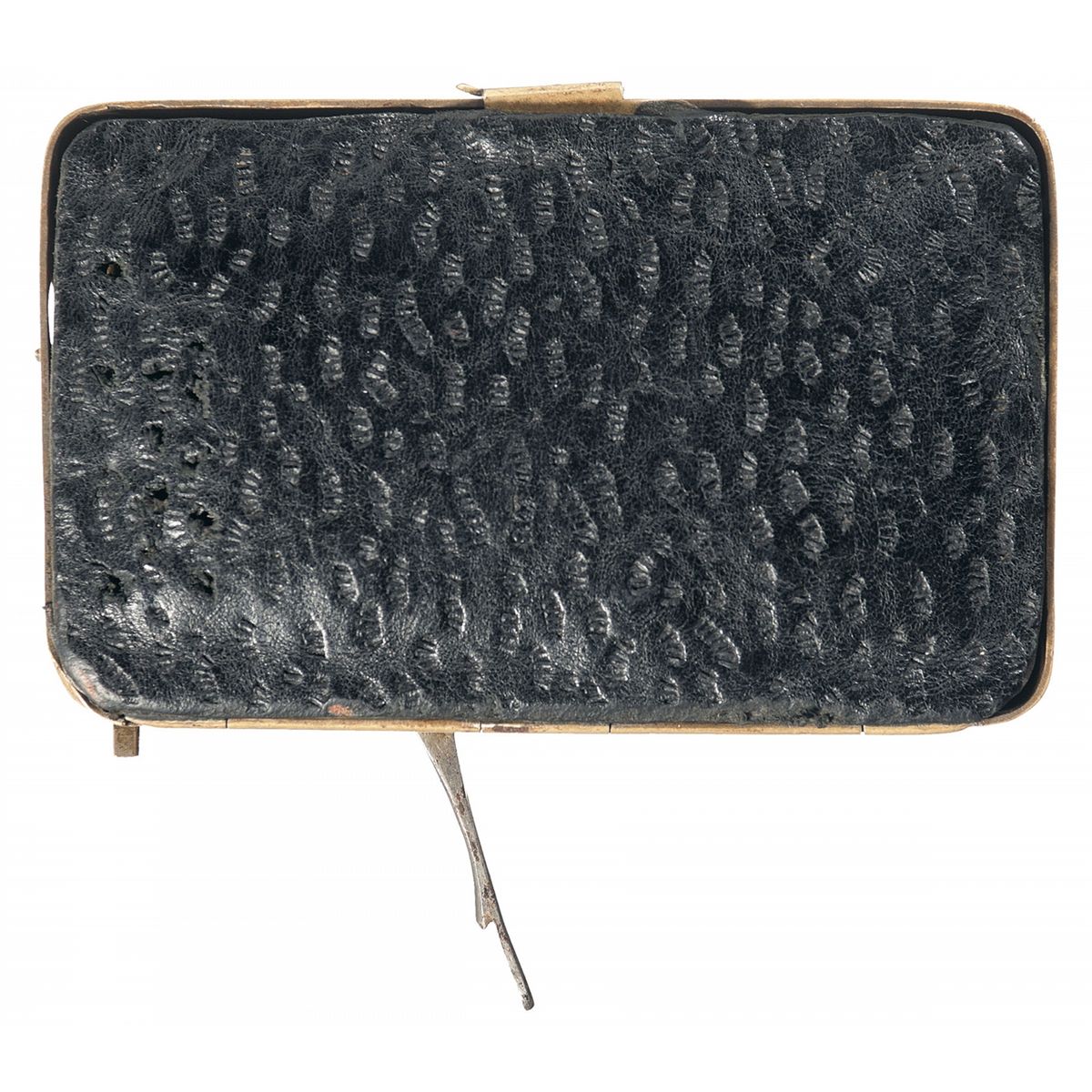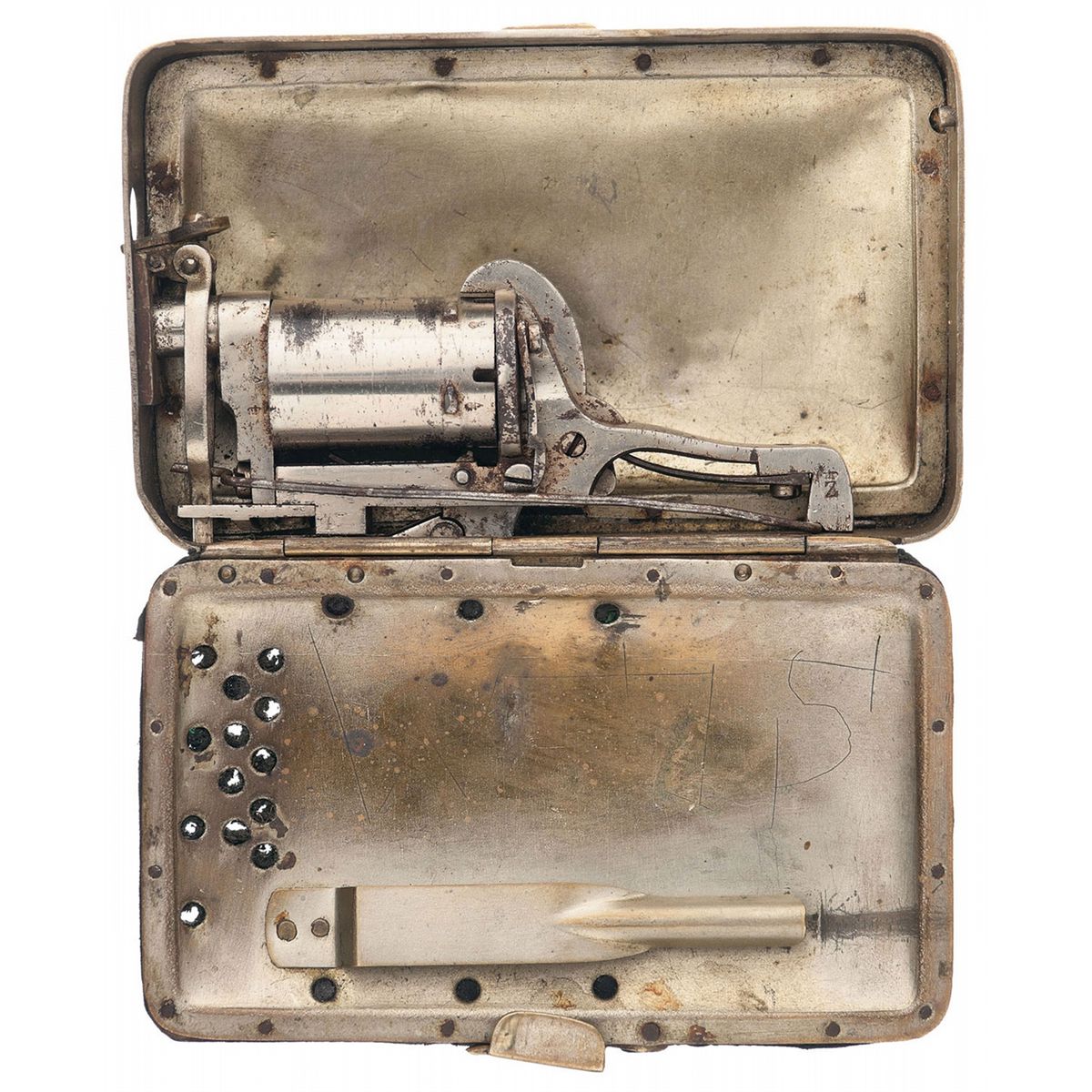 Discussed in Winant's "Firearms Curiosa", with an example pictured on page 159, the Frankenau was patented in both England and America in 1877, and performed double duty as a change purse and as a 5-shot defensive revolver. Though sights are not included, the typical armed robbery scenario (very short ranges and poor/non-existent light) renders the disadvantage moot, and the innocent appearance of the arm allows it to be brought into play on the pretence of surrendering it to the assailant. The outer case is silver finished brass with black leather side panels, marked "FRANKENAU'S PATENT." along the top, with a conventional spring-loaded pushbutton release on the top right, and a manually operated, flat-laying latch on the left. Pushing the button opens up a shallow but functional storage compartment, while the latch permits access to the main compartment and the revolver, which is marked with London proofs on the cylinder and a "crown/Z" on the rear. Also inside the compartment is a spring loaded retainer for an ejector rod (not included) and a series of holes in the lid near the muzzle and air gap, to permit the venting of gases after firing. The folding trigger is mounted on the underside, and is connected to a hinged muzzle cover on the front; opening one automatically opens the other, increasing the speed that the revolver can be brought into play.