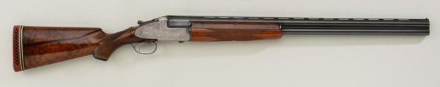 Scarce and desirable high grade Aya Model 37 Super O/U 12 gauge shotgun with 2 sets of barrels and highly engraved full side locks with ejectors and single triggers made for Lela Franks. The gun shows nicely engravedscenes of game birds on both locks that are deeply cut and surrounded by fine scroll. The bottom of the frame is gold inlaid “Carola Mandel”. The action is French gray or bright finished and the barrels are blued. The No. 1 barrel measures 27-1/2” in length, choked .33 about improved modified and lower barrel is choked .08 about skeet. The second barrel measures 29-1/2” and is choked .53 extra full and .36 full. Thestock measures 12-1/8 “to the end of the wood and 13-3/8” to the end of the thick pad with 2 spacers. The stock shows a 1-1/4” drop at the heel and a 1-3/8” drop at the comb with a 1/8” cast at the heel and high rise comb.The barrels show ventilated ribs and 95% plus original finish with frame near excellent. The stocks are good with repair and refinishing and replacement of comb which is well done. The case is in good condition