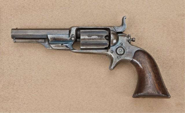 Scarce model 1855 Root, .31 caliber percussion revolver, 3-1/2” octagon barrel, Hartford address without pointing hands. Blue finish, wood grips, serial #1639, fourth variation. Refer Flayderman 5B-068. The revolver remains in original good condition showing 15-25% original blue, evenly drifted and now turning to a brown patina. Good edges, good markings, generally good metal surfaces with just a few areas of light erosion and pinprick pitting in small areas on the barrel and cylinder. The hammer shows some bright original case hardening. The grips are fair to good with some nicks, mars, several small losses at heels, and two notches on right grip. The action is good, the markings are good, the interior very good. A somewhat scarce variation of less than 1200 produced. Est: $900 - $1,800