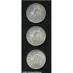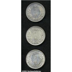 <B>Scarcer date 50 Sen trio as follows:</B></I> Meiji 33 (1900), KM-Y25, Choice AU; Meiji 37 (1904), KM-Y25, AU; and a Meiji 38 (1905), KM-Y25, AU. 3 coins <BR><BR><B>Important notice:</B> Heritage usually auctions material at the rate of 200-250 lots per hour. On some occasions eBay Live bid software or the Internet may not be able to keep up with the pace of the auction. We recommend placing a realistic absentee bid now as insurance to avoid disappointment. Occasionally the auctioneer may eliminate or reject an eBay Live bid, and the auctioneer may also reopen a lot after the close of the eBay live bidding (usually because we missed an audience bid), and may reject your bid even if it shows you as the winning bidder. By bidding via eBay Live, you agree that Heritage may award the lot to another bidder at its sole discretion under the circumstances described above or any other reasonable circumstances. Since eBay bids are not shown to us until we open the lot on the floor, we treat those bids just like floor bids. In most cases the floor responds before the eBay bid is presented to us, due to Internet lag time, so for consistency we have made it a policy that floor bids are always considered first over tie eBay live bids. Also please note that all Heritage lots purchased through eBay Live carry a 20% Buyer's Premium. Please make sure you read the Terms and Conditions before you bid.