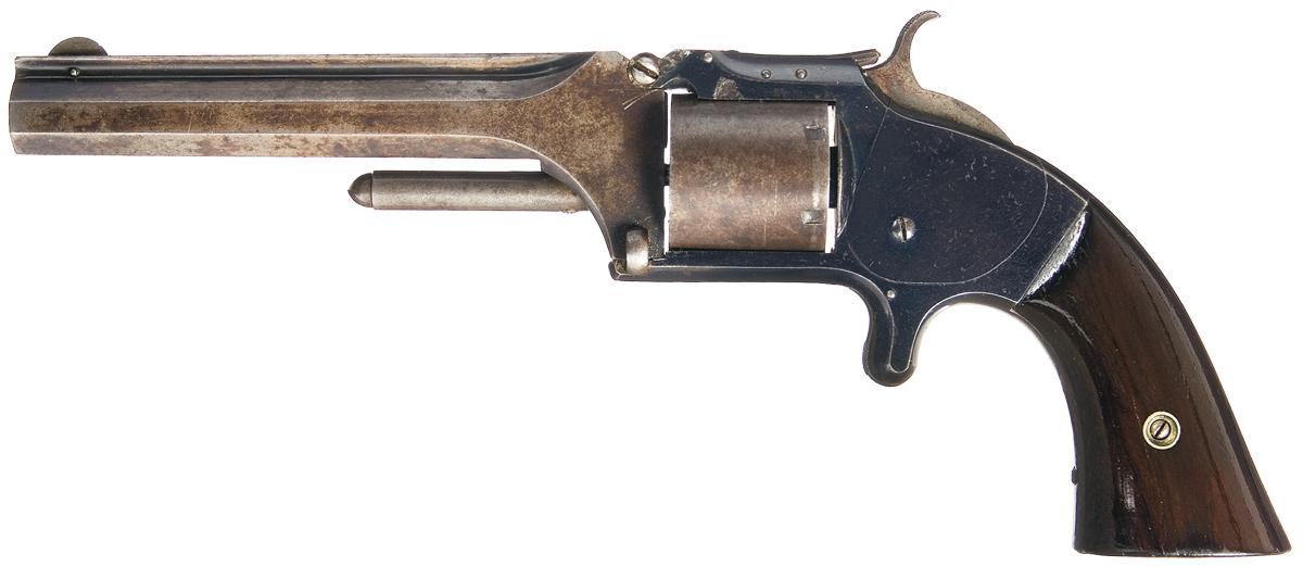 Manufactured from 1861 to 1874. This model was very successful commercially. It is marked with the one line address on top of the barrel rib, tip up action, fixed sights, un-fluted cylinder and is fitted with smooth two piece rosewood grips. Matching serial number on frame, cylinder, right grip panel, and barrel.