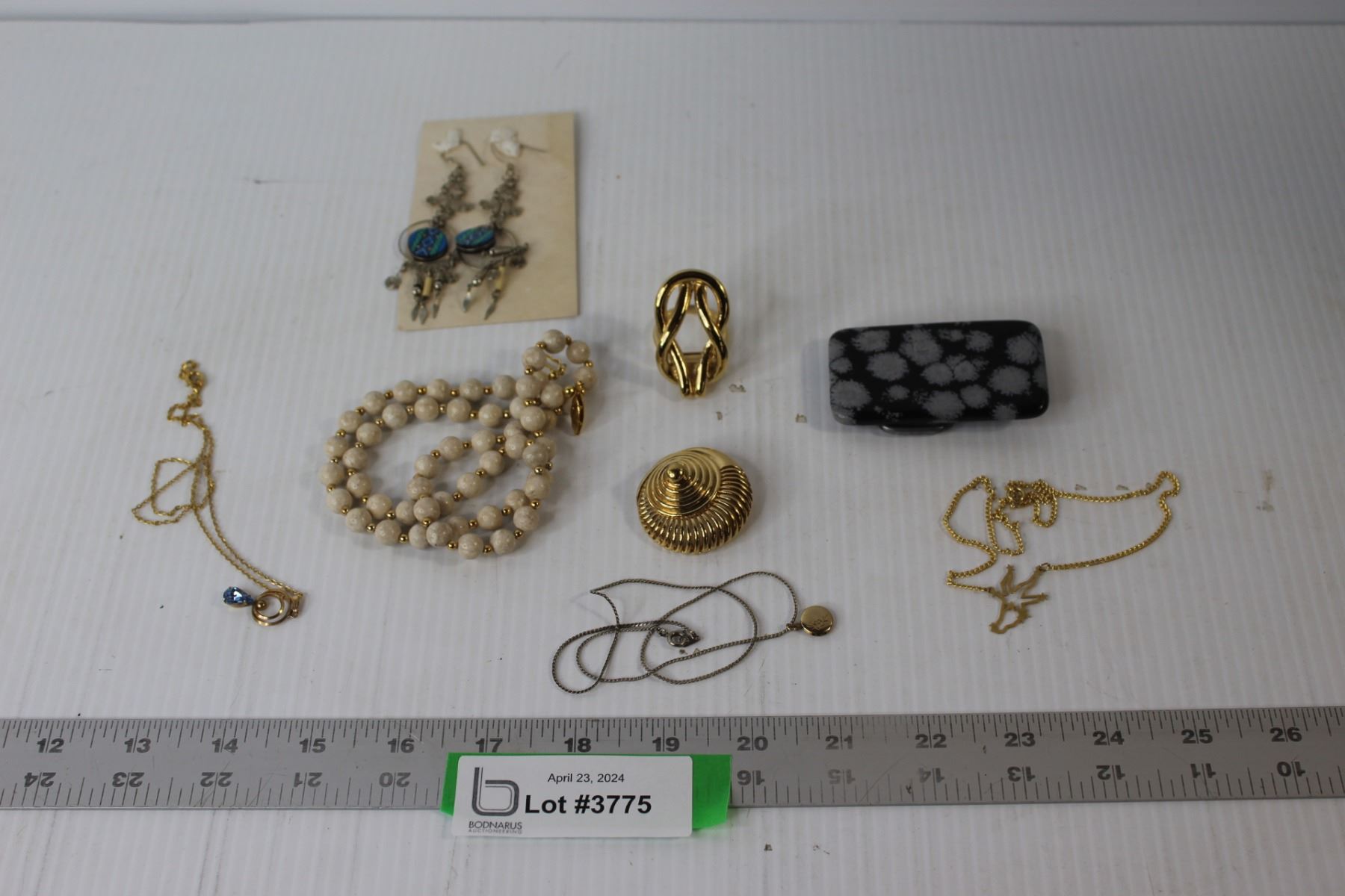 Scarf Clip, Shell Brooch, Snowflake Obsidian Belt Buckle, Capricorn Necklace, 23" Stone Necklace, (2) Pendants on Chains, Earrings