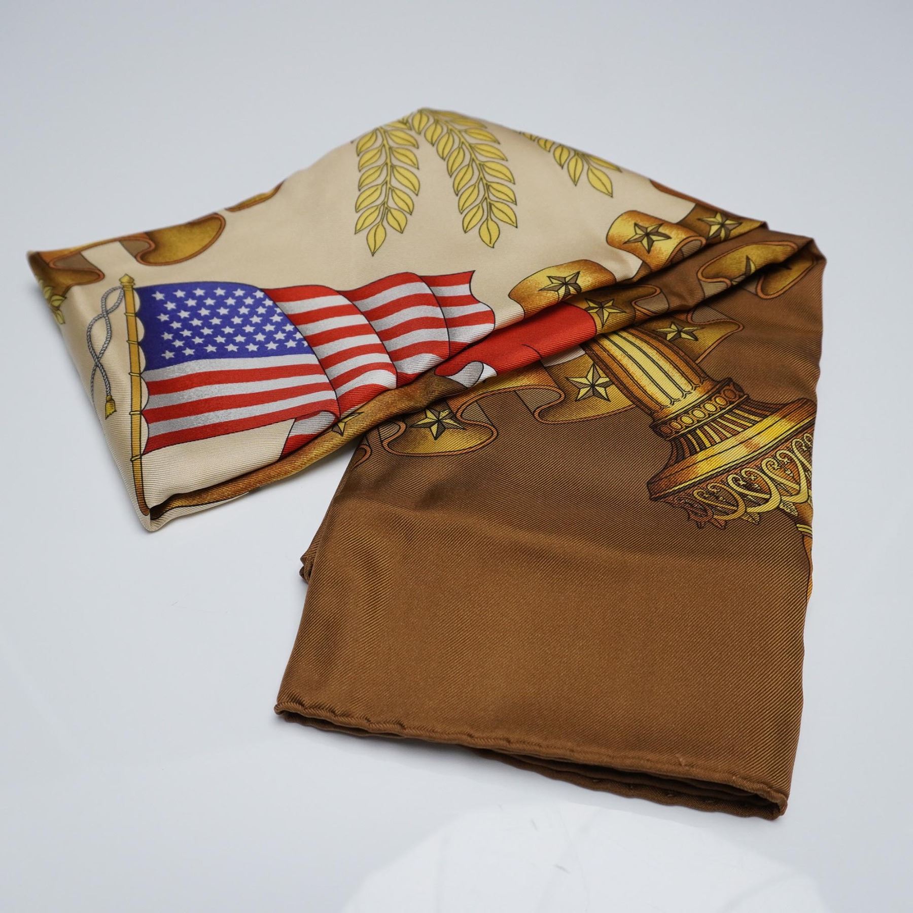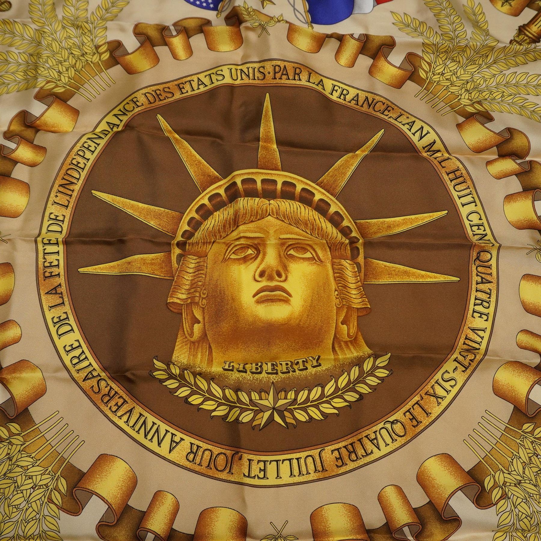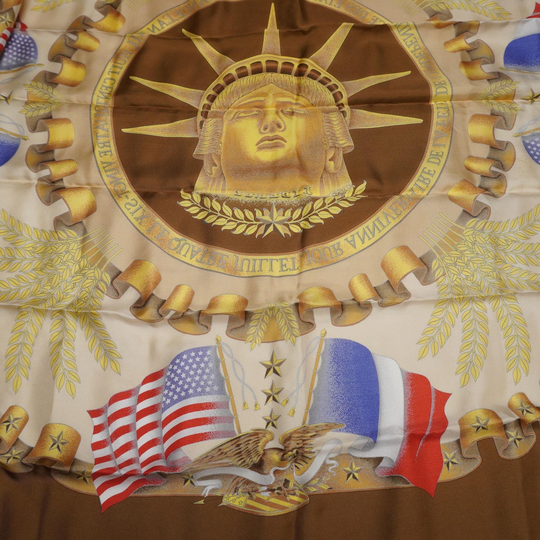 Elegant silk scarf featuring a richly detailed design celebrating Franco-American unity, with the Statue of Liberty's golden visage prominently centered among laurel leaves, banners, and symbolic stars. The design incorporates both the American and French flags along with an eagle crest, referencing the shared ideals of liberty and alliance. The scarf uses a warm palette of browns, golds, reds, and blues on a smooth silk fabric, with hand-rolled edges. Measures 33"L.