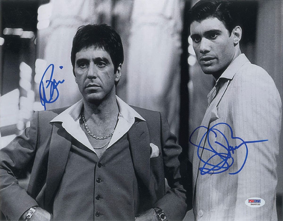 Satin-finish 14 x 11 photo of Al Pacino as Tony Montana and Steven Bauer as Manny Ribera in the 1983 film Scarface, signed in blue felt tip by both. In fine condition. Accompanied by a certificate of authenticity from PSA/DNA.