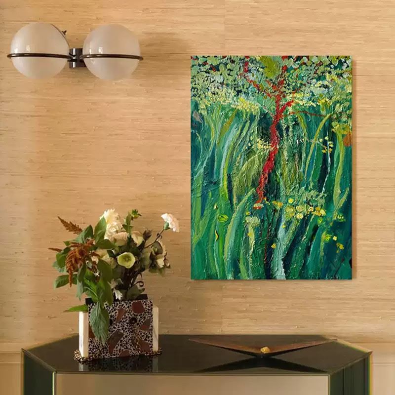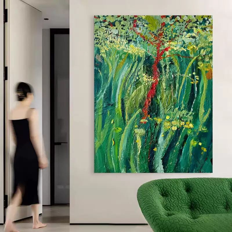 Waves of deep green sweep across the canvas like wind-tossed grass and leaves, while a vivid red trunk rises boldly through the center, scattered with tiny yellow blossoms. The thick, textured strokes make the colors collide and shimmer, as if a quiet meadow were pulsing with a sudden, blazing heartbeat. Dimensions: 24 x 31 inches.