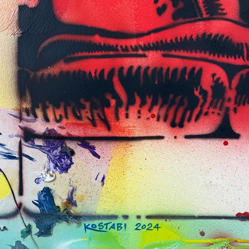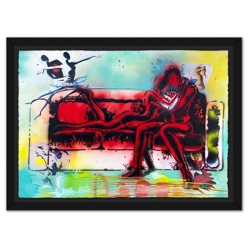 "Scarlet Passion" is an original mixed media painting on paper by Mark Kostabi, hand signed by the artist. The piece comes framed. Includes Certificate of Authenticity. Measures approx. 35.5" x 48" (frame), 29.5" x 42" (image). This item requires special handling and may have a longer than usual turnaround.