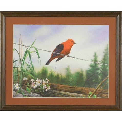 This very attractive print is full of the warm and bright colors of summer. The bright red feathers of the Scarlet Tanager are in sharp contrast to the cool blue sky that is behind it. Woodhouse has an excellent sense of perspective and he pays close attention to details. This 13? x 16? picture is beautifully framed in a dark stained wood frame that accents the dark colors of the picture and matted in a terracotta colored mat the highlights the bright reds of the bird. It is available for an excellent price.