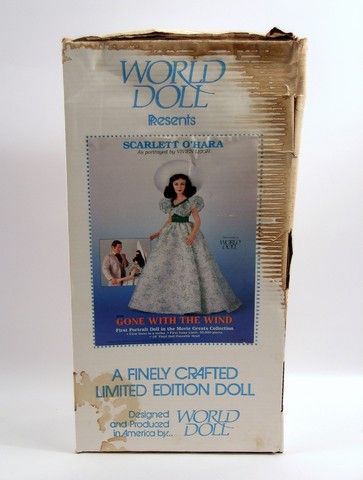 A Scarlett O'Hara as portrayed by Vivien Leigh World Doll Collectable from "Gone With The Wind". It's one of the first portrait Dolls in the "Movie Greats" Collection. Doll is made of vinyl and is 19". Has Limited Edition COA inside. Comes in original box which has some wear and water damage.