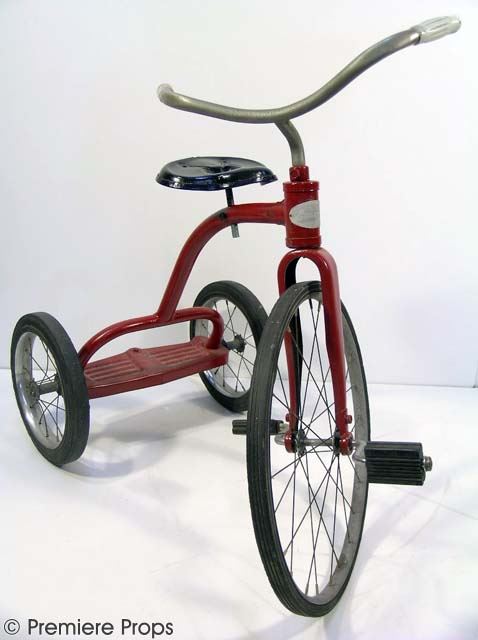 Hero Red Tricycle Prop screen used for the "Saw" parody by the Saw Villian #1 - (38” long front to back / 18.5” wide from rear wheel to rear wheel / height 32” / spoked wheels / hard rubber tires (non-inflatable) / metal placard on front with manufacturer's mark, “Eatonia” / white rubber handle grips with heavy wear / toddler pedals / raised seat has four holes drilled on top / moderate rust / all parts very worn /Pick up only. This item cannot be shipped. If purchased out of the state of CA, purchaser is responsible for pick up by a third party shipping company.