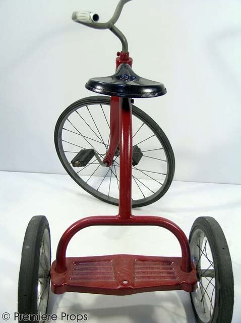 Hero Red Tricycle Prop screen used for the "Saw" parody by the Saw Villian #1 - (38” long front to back / 18.5” wide from rear wheel to rear wheel / height 32” / spoked wheels / hard rubber tires (non-inflatable) / metal placard on front with manufacturer's mark, “Eatonia” / white rubber handle grips with heavy wear / toddler pedals / raised seat has four holes drilled on top / moderate rust / all parts very worn /Pick up only. This item cannot be shipped. If purchased out of the state of CA, purchaser is responsible for pick up by a third party shipping company.