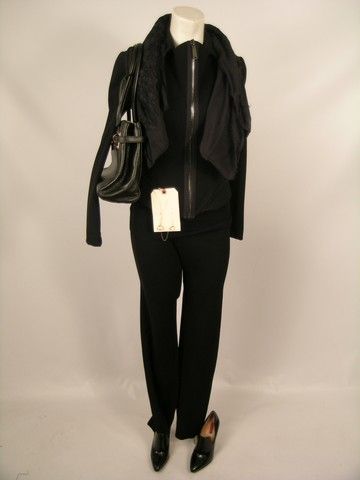 Barbara (Heather Locklear) screen worn, hero, black zipper up the front long sleeve 'Ellie Tahari for Nordstrom' jacket, (size 2) black short sleeve 'Carmen' top, (size XS) black lace scarf, black leather 'Zenith' purse, faux gold earrings and necklace, black 'Ellie Tahari for Nordstrom' stretch pants, (size 2) and black slip on heels.