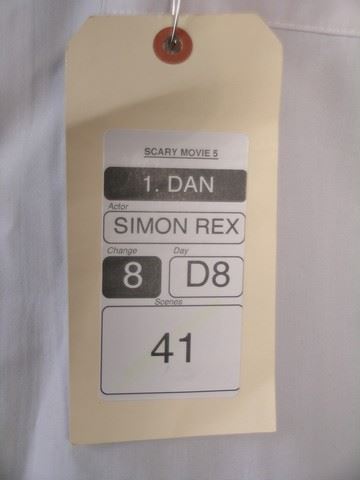 Dan (Simon Rex) screen worn, hero, tech white three quarter length 'Landau' lab coat with 'Genetic Primate' patch on the chest, (size 42) sky blue with white stripes 'Ben Sherman' button down shirt, (size L) white t-shirt, dark blue with light blue and ecru slashes 'Jos. A Bank' neck tie, black leather with metal buckle belt, (size 36) and navy with crease 'Jos. A Bank' dress slacks. (size 34) Includes wardrobe tag!
