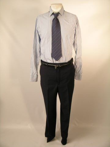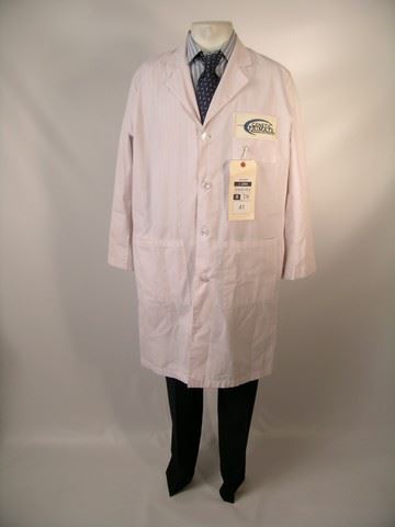 Dan (Simon Rex) screen worn, hero, tech white three quarter length 'Landau' lab coat with 'Genetic Primate' patch on the chest, (size 42) sky blue with white stripes 'Ben Sherman' button down shirt, (size L) white t-shirt, dark blue with light blue and ecru slashes 'Jos. A Bank' neck tie, black leather with metal buckle belt, (size 36) and navy with crease 'Jos. A Bank' dress slacks. (size 34) Includes wardrobe tag!