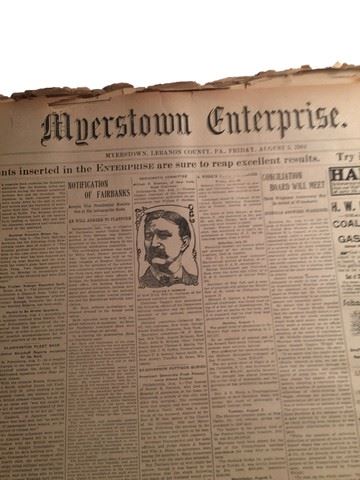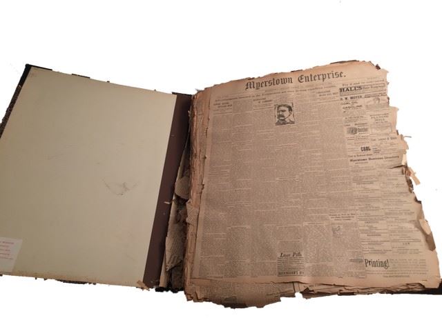 Screen used, large book from " The Mill Valley Enterprise" " Volume V111 1808-1899", newspapers in a large book very fragile due to the age of the newspaper.(21x26)