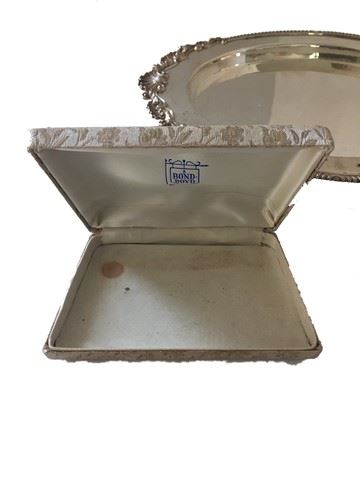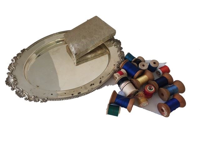 Sarah Bellows (Kathleen Pollard) screen used, silver platter, used on Sarah's dresser top, spools of thread ~15, and a gold case. (15x10)