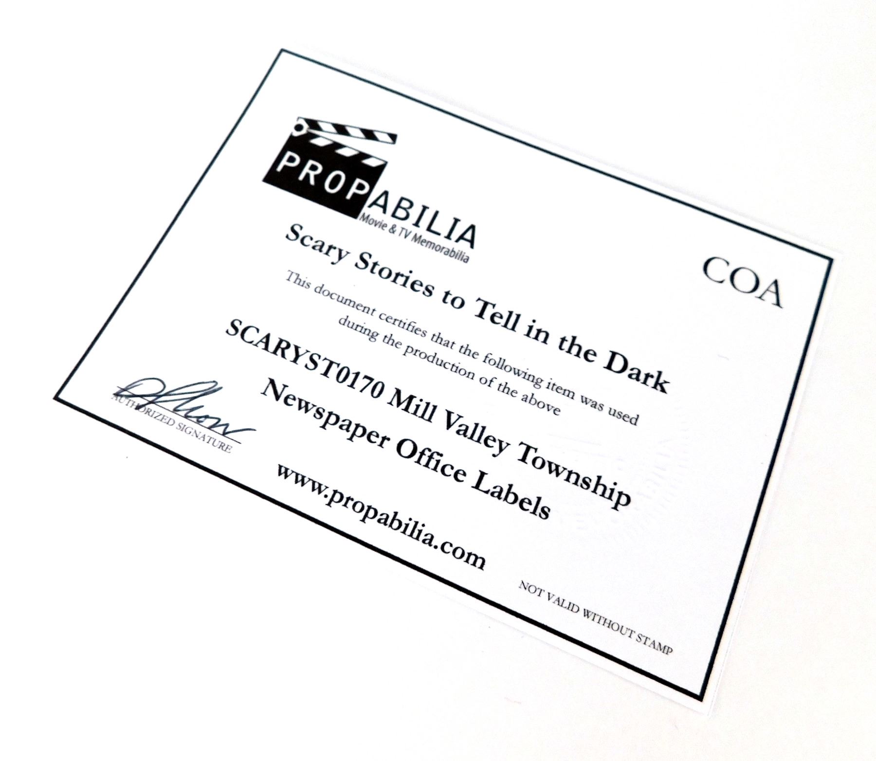 This Mill Valley Township Newspaper Office Labels was acquired by the production for use in 'Scary Stories to Tell in the Dark' (Lionsgate, 2019).
