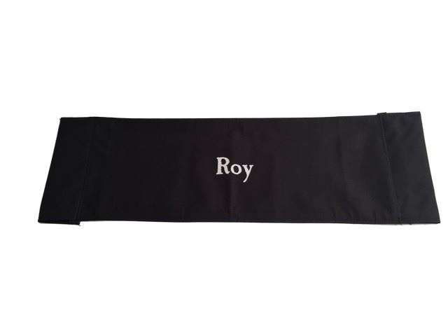 Black canvas chair back labled "Roy" from the set of production. (25x8)