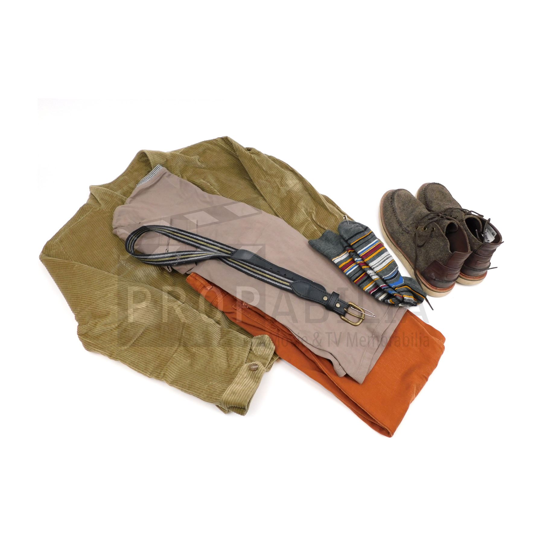Custom cord jacket, pants, belt, shirt, socks, shoes.