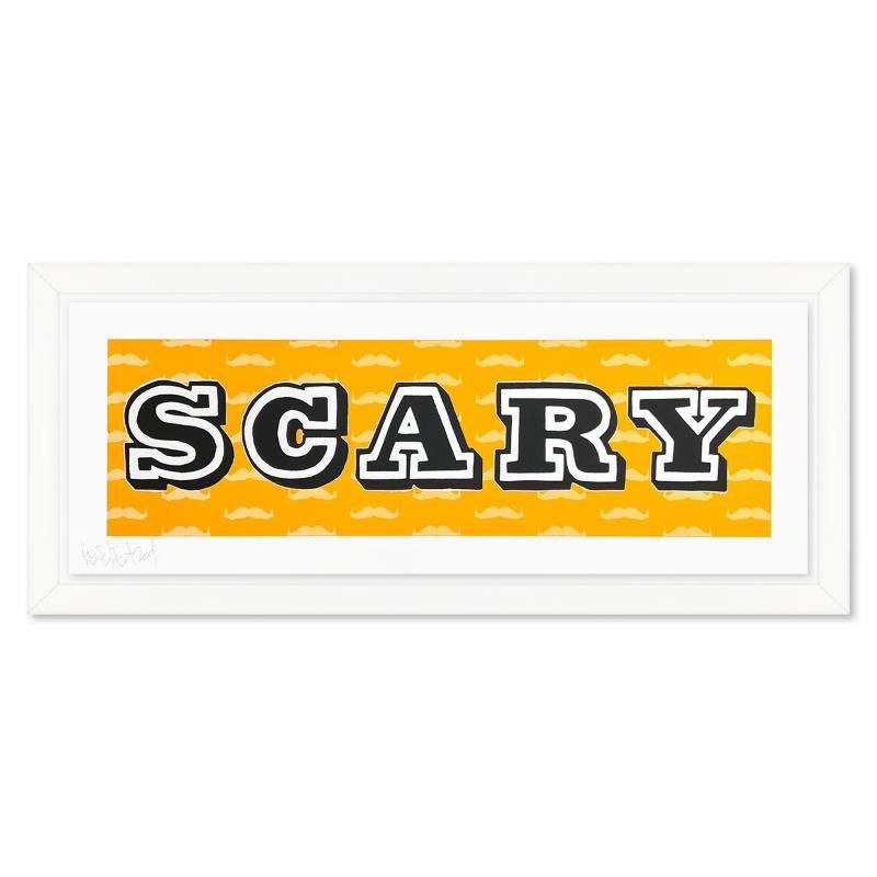 "Scary" is a limited edition screen print on paper by Ben Eine. This piece is numbered and signed by the artist. Comes custom framed with Letter of Authenticity. Measures approx. 36.5" x 17" (frame), 30.5" x 11" (image).